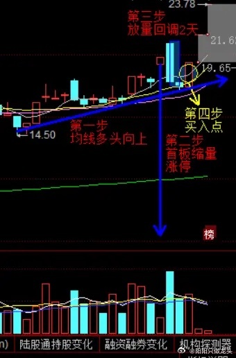 缩量涨停战法四步骤:第一步,多头均线向上趋势第二步,首板缩量跳空高开秒板第三步,