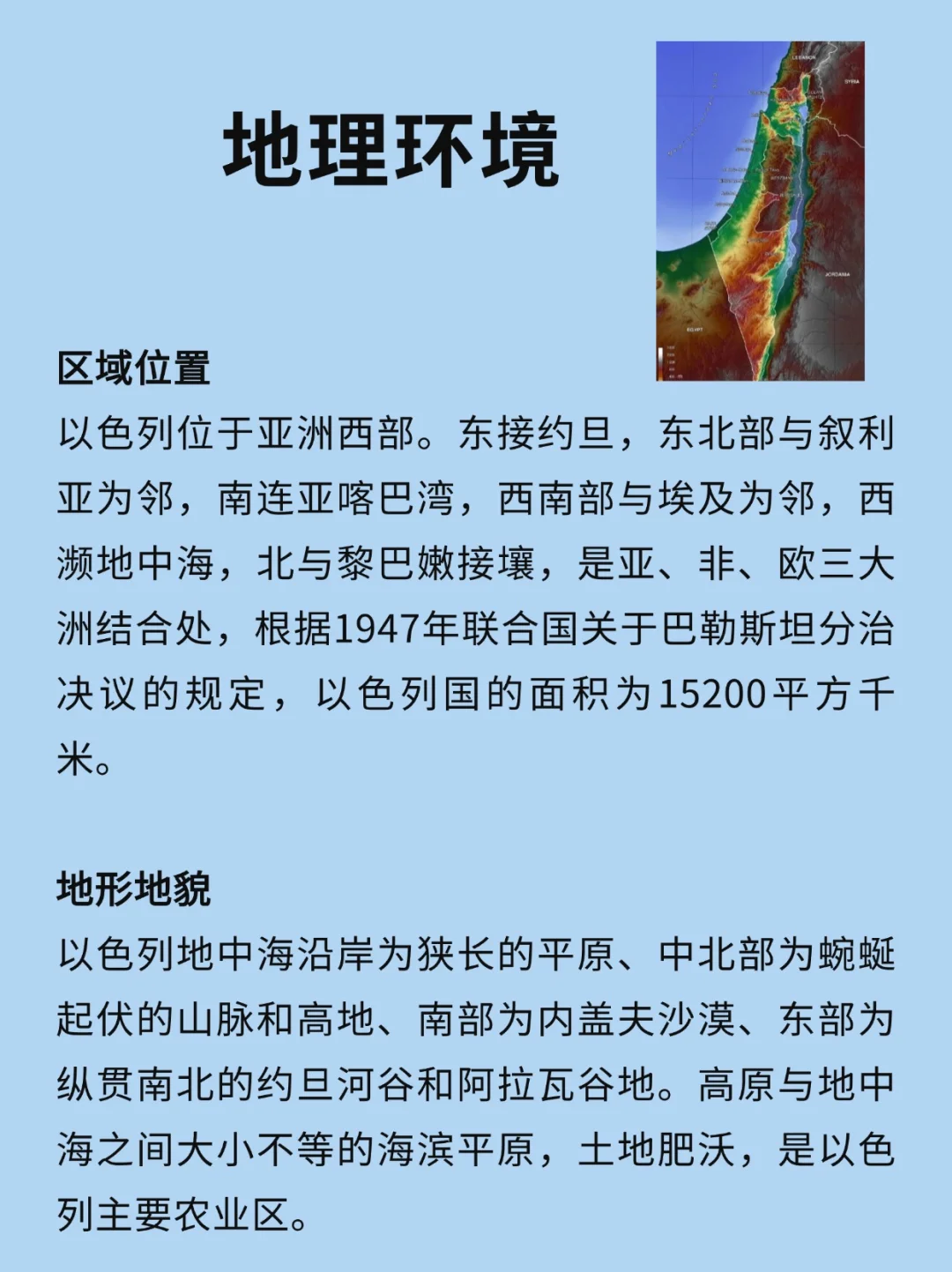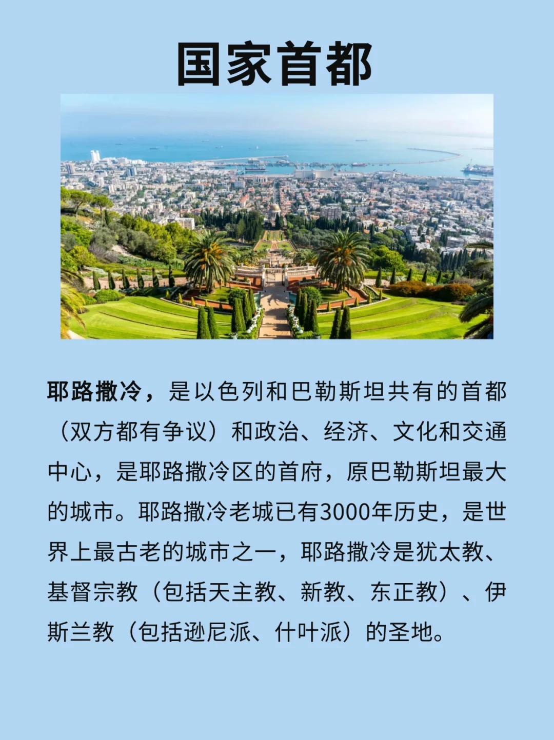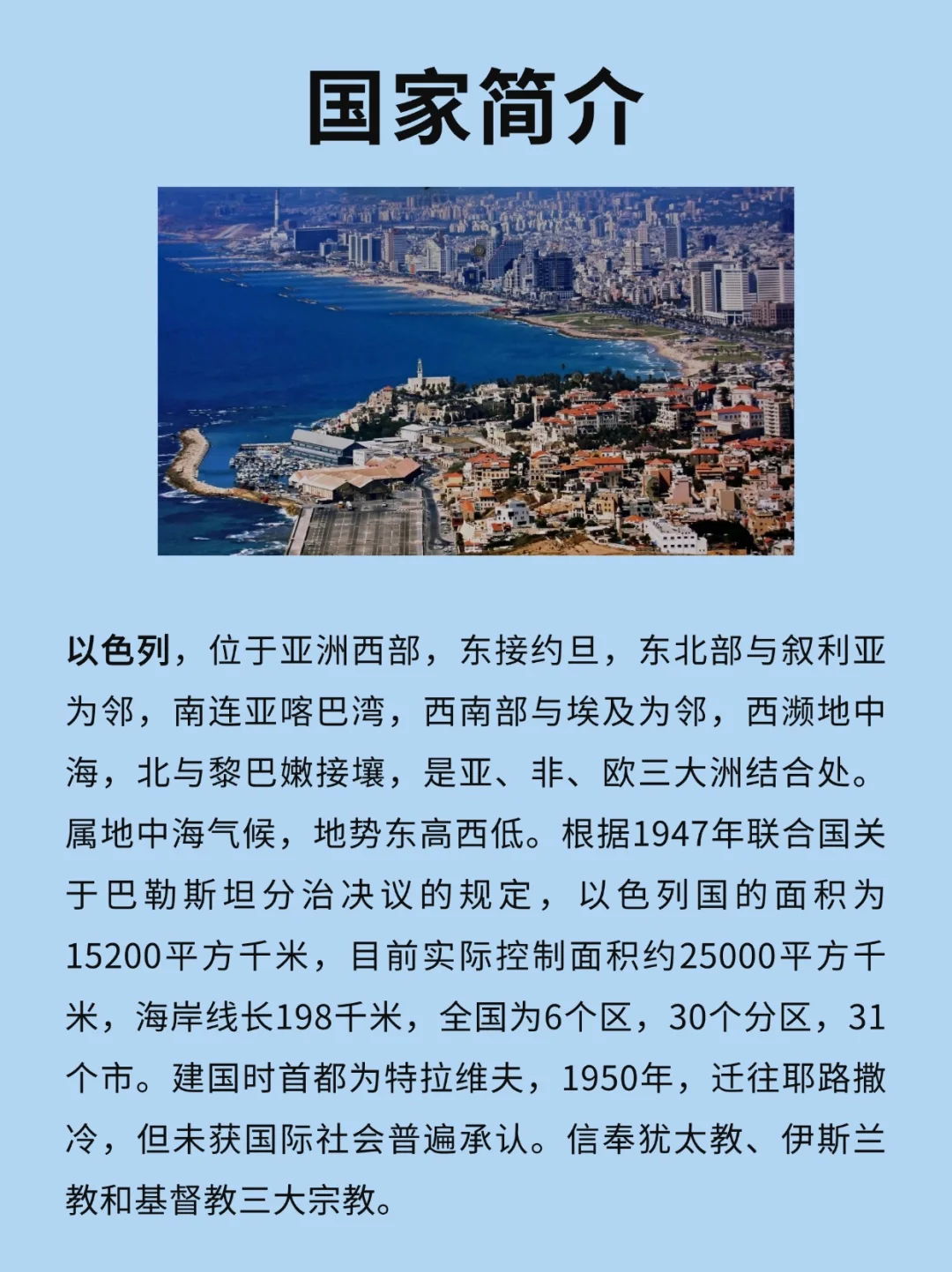 以色列,位于亚洲西部,东接约旦,东北部与叙利亚为邻,南连亚喀巴湾,西南部与埃及为邻,西濒地中海,北与黎巴嫩接壤,是亚、非、欧三大洲结合处。 以色列地中海沿岸为狭长的平原、中北部为蜿蜒起伏的山脉和高地、南部为内盖夫沙漠、东部为纵贯南北的约旦河谷和阿拉瓦谷地。 [打卡R]以色列的首都耶路撒冷,是以色列和巴勒斯坦共有的首都(双方都有争议)和政治、经济、文化和交通中心,是耶路撒冷区的首府,原巴勒斯坦最大的城市。 欢迎在评论区下方⬇️留言补充哦~ -