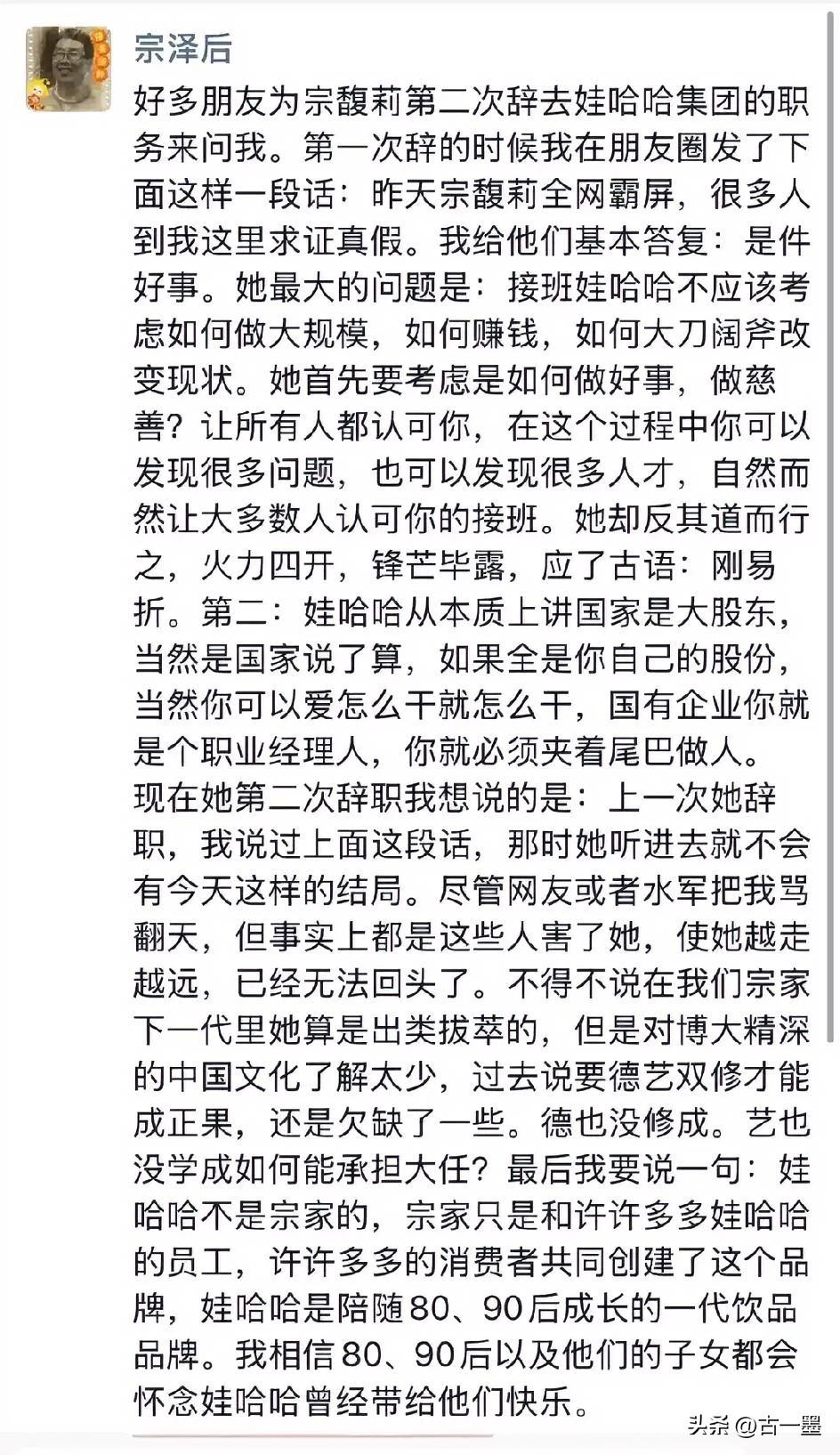 宗泽后隔空喊话:宗馥莉,娃哈哈不是宗家的,咱们就是打工人,要夹尾巴做人,他还指责