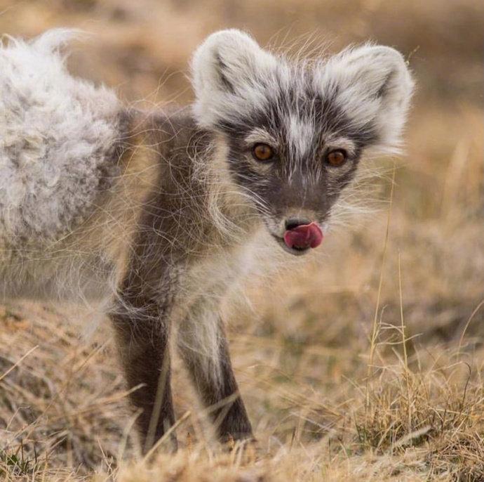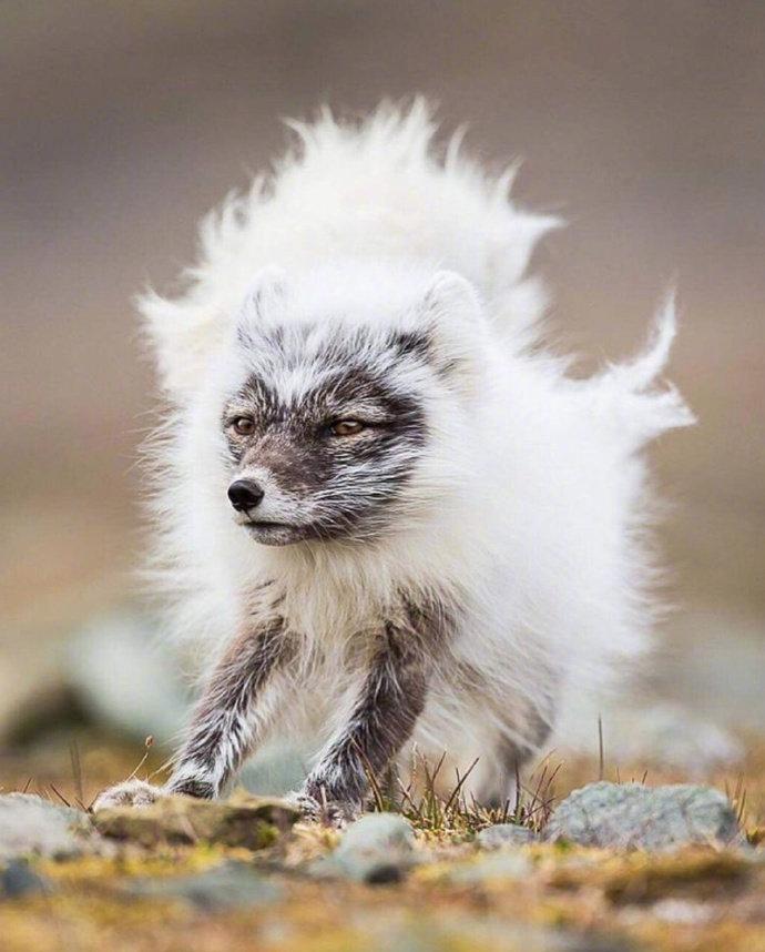 北极狐换毛期的尴尬瞬间,白色的毛会开始脱落,长出青灰色的毛,所以就会有一段过渡期长出两种颜色的毛
