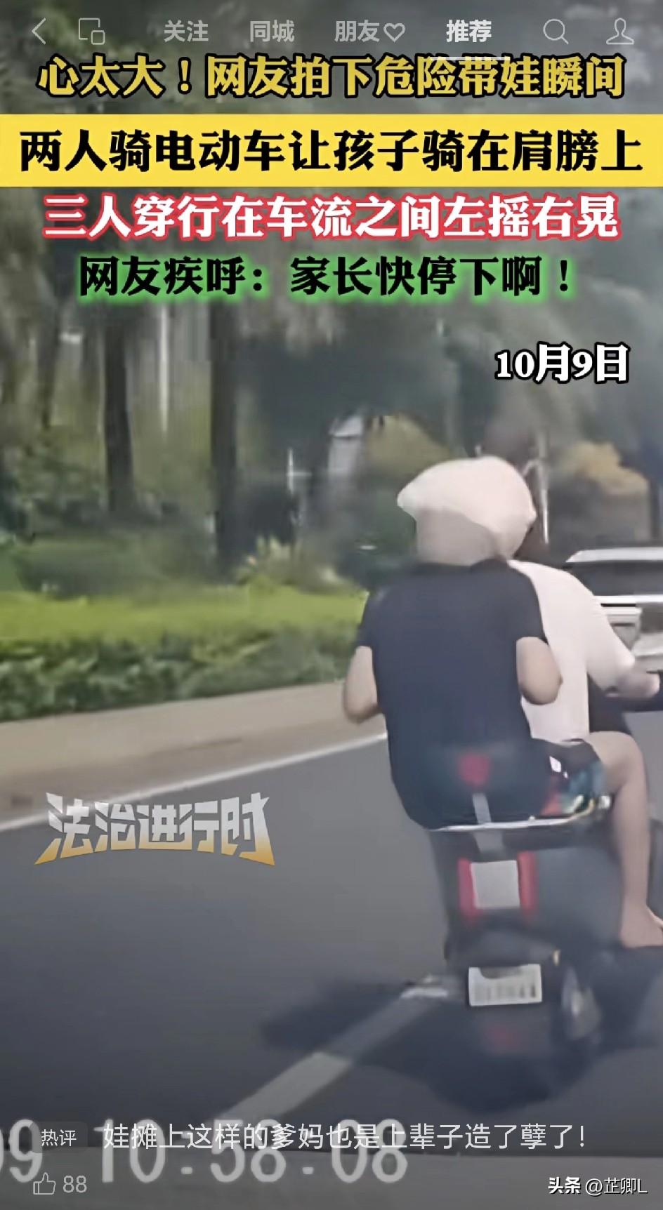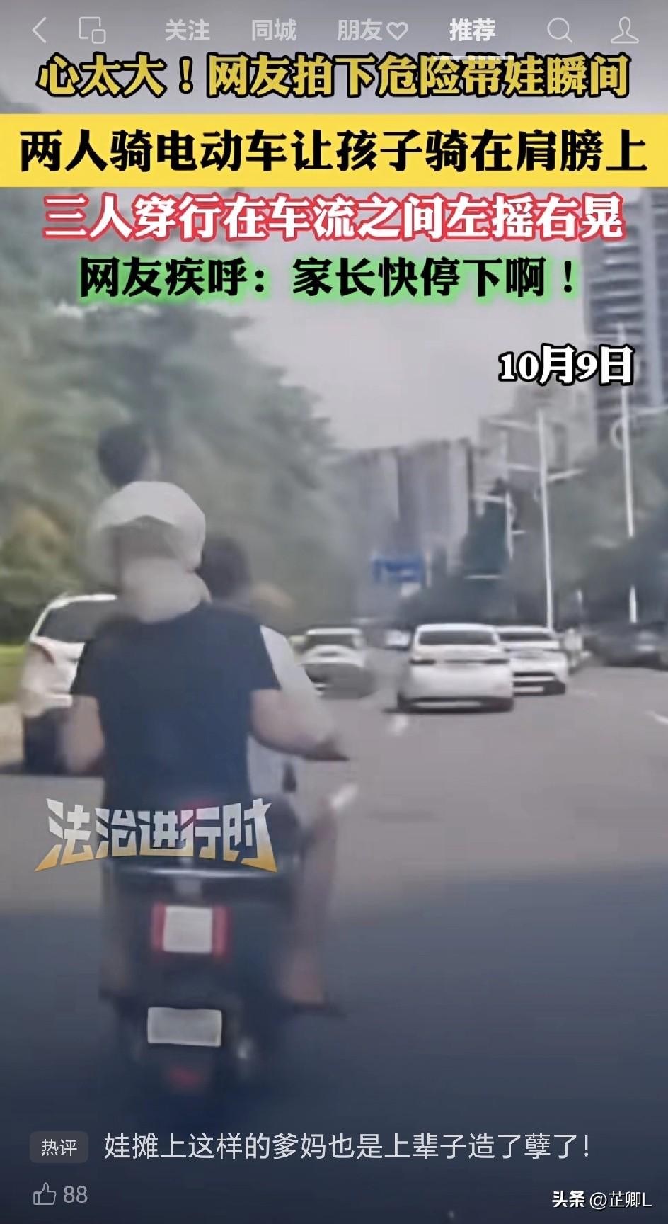 10月9日,有网友拍下了街头的惊险一幕。 车水马龙中,两个人骑电动自行车,后面坐着的人肩膀上还托着一个孩子。三个人都没有戴头盔,电动车在车流中穿行,左摇右晃。 让人看了,不由得暗捏一把冷汗! 评论区的网友们义愤填膺: “这孩子怕不是亲生的吧?” “娃摊上这样的爹妈也是上辈子做了孽了!” “心真大啊!” “真是虎啊,天底下上哪儿找这样虎的爹妈去?” “这是拿孩子当玩具吧!” “自己不要命,还要拉着孩子一起!” 更有网友说,路上碰到一个没戴头盔的女士骑电动车,左右摇晃。走近了才发现,原来女子一只手拿着手机在看,一只手抓着车把前行。更要命的是,她怀里居然还带了一个孩子。 这些人真是心大,真是虎,真是不要命啊! 有个网友的建议非常好,建议我们的有关部门研究下剥夺监护权的事情。 有些人真的不配为人父母,不配拥有孩子的监护权! 或许真的把剥夺监护权的事情提到立法的高度,可以对某些不负责任的父母多多少少有些震慑作用! 信息来源于法治进行时,侵联删!