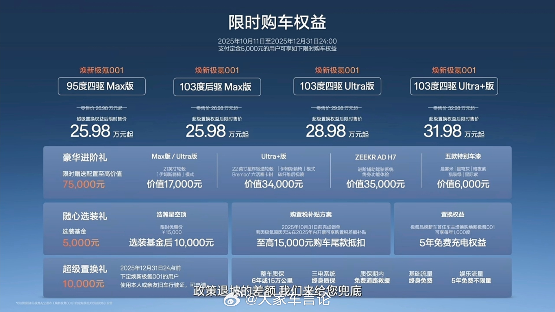 焕新极氪001正式登场,限时25.98w起。全系焕新900V架构,千里浩瀚H7辅