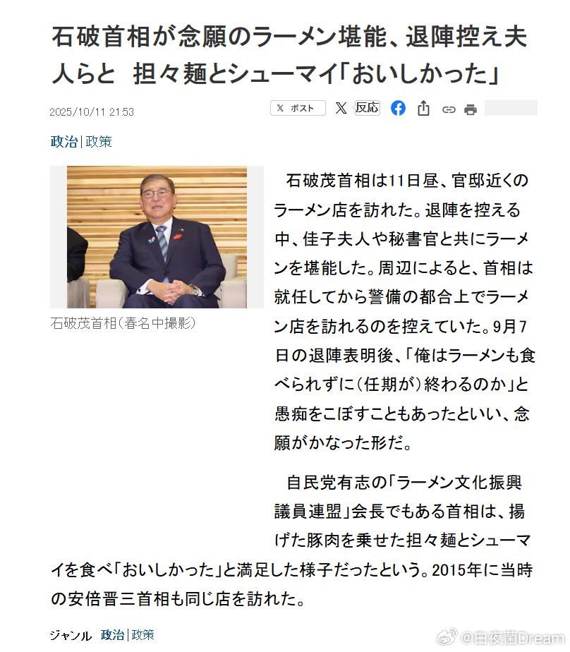 🔻日本首相石破茂终于吃到期待已久的拉面。
