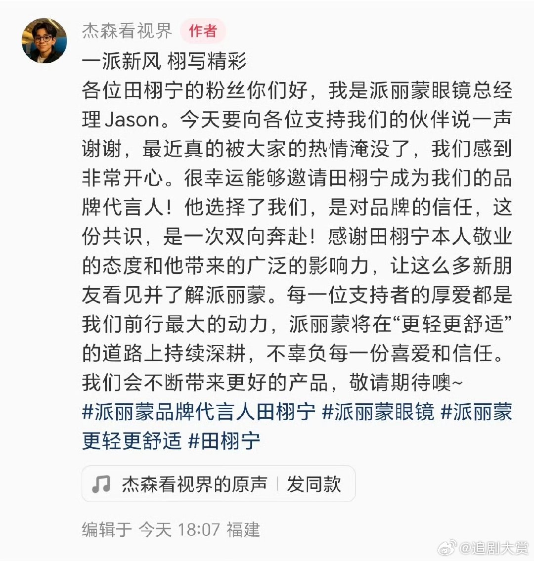 派丽蒙总经理感谢田栩宁派丽蒙总经理发文感谢田栩宁 派丽蒙总经理发文感谢田栩宁,可以的 ​​​