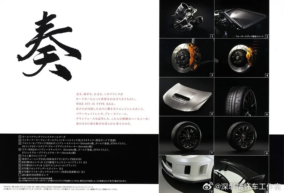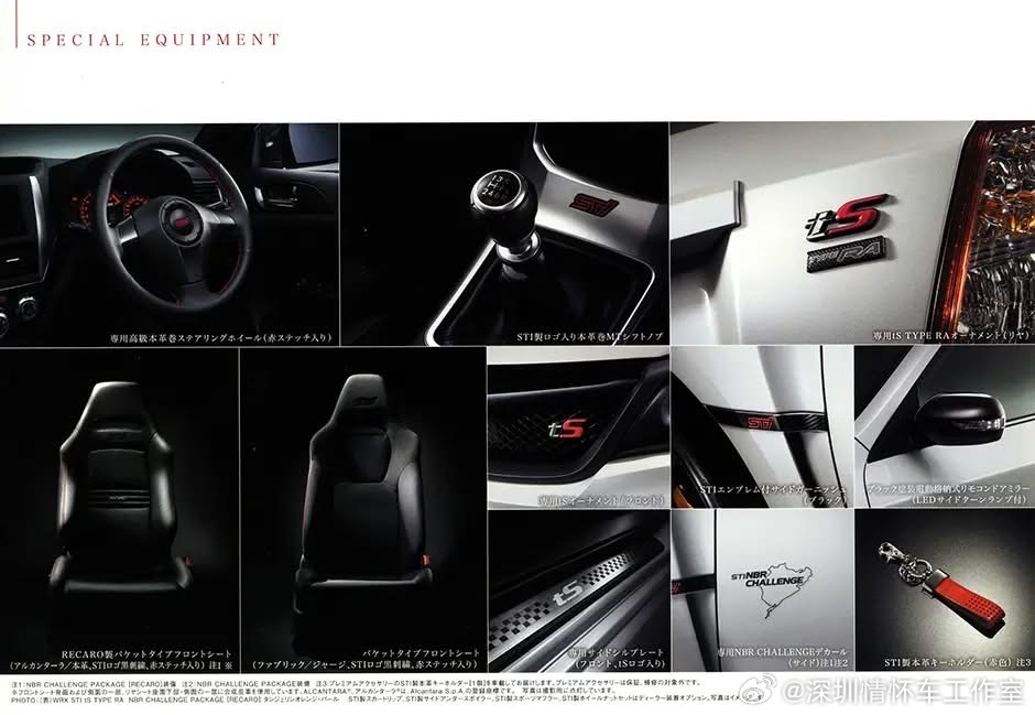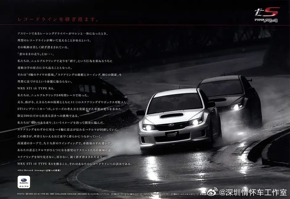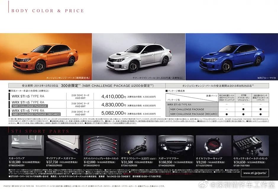 斯巴鲁STI TS是斯巴鲁旗下高性能部门STI(Subaru Tecnica International)调校的特别版车型。2013款WRX STI tS TYPE RA:基于GVB WRX STI四门轿车系列中规格最激进的Spec C打造,限量300辆。该车配备11:1转向比的快速转向变速箱和Brembo前六活塞刹车,车身采用特殊的橘子橙珍珠色,搭配黑色18英寸铝轮圈。发动机为EJ20,最大功率和扭矩与2010款相同。