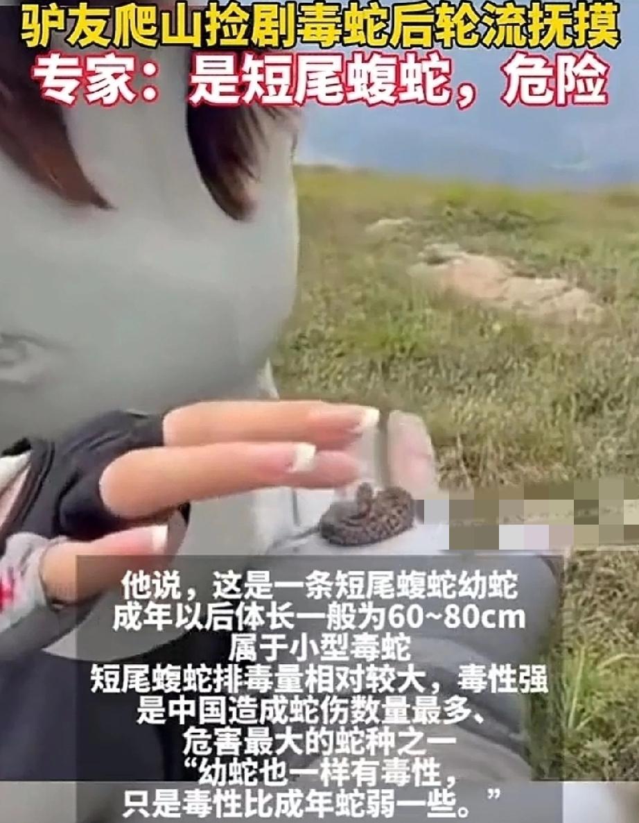 近日,一男子和驴友们爬山,遇见一条幼蛇。它蜷缩成一团,一副楚楚可怜的模样。男子不认识这条蛇,便把它捧在手心里,问其他驴友,有谁认识这条蛇。 其他驴友围了过来,看这条小蛇宝宝还是挺可爱的,轮流抚摸它。小蛇表现比较温顺,任由大家摸它。男子见自己抓的蛇,引起大家的兴趣,不免有些得意,问大家,好玩不好玩?并把视频发布到网上。 10月10日,华希昆虫博物馆馆长赵力看了视频后指出,视频蛇为短尾蝮蛇,它喜荫凉,适应性强,分布广,常出现在人类活动区域。以排毒量大,毒性强,成为中国蛇伤数量最多,危害最大的蛇种之一。 男子真的是无知者无畏,不了解蛇,还敢抓蛇。别以为幼蛇不会咬人,它是野生动物有其野性,一旦野性大发,就会伤人。所以,不了解蛇,最好还是敬而远之。 驴友爬山捡到小蛇轮流抚摸 专家提醒蝮蛇