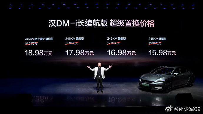汉 EV 长续航版 超级置换补贴后售价15.98万-20.58万元