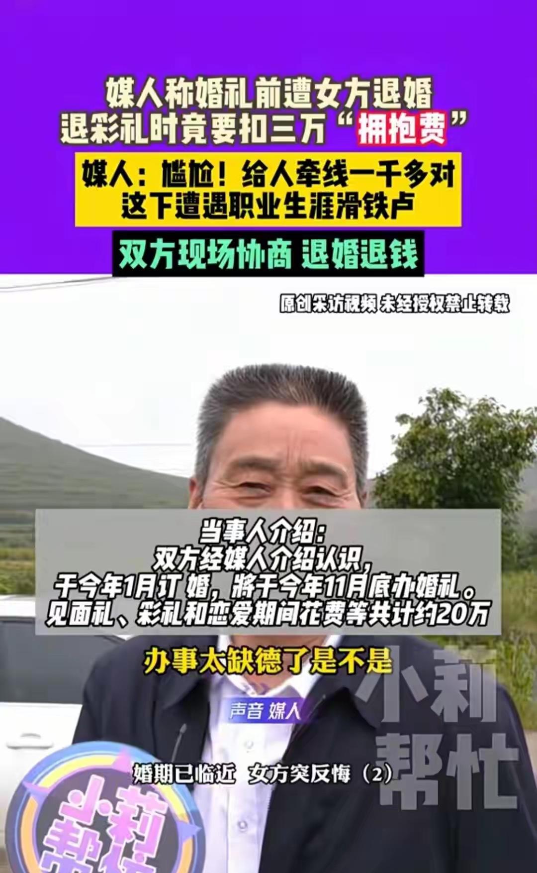 这彩礼纠纷真是离谱他妈给离谱开门,离谱到家了!河南平顶山的万先生,订婚给了女方约20万彩礼和四金,结果女方在婚礼前俩月突然悔婚。更奇葩的是,退彩礼时竟要扣3万“拥抱费”,就因为拍婚纱照时有个拥抱。女方家说这涵盖恋爱花费,可恋爱花费能精确到拥抱一下就值3万? 做媒多年的媒人都说头回见这事儿。类似彩礼纠纷不少,像江苏曾有女方悔婚只退车不退礼金,法院判决女方返还全部礼金。这事儿里,最终女方退了170500元,只能说这“拥抱费”实在荒唐。 彩礼事情 彩礼纠纷