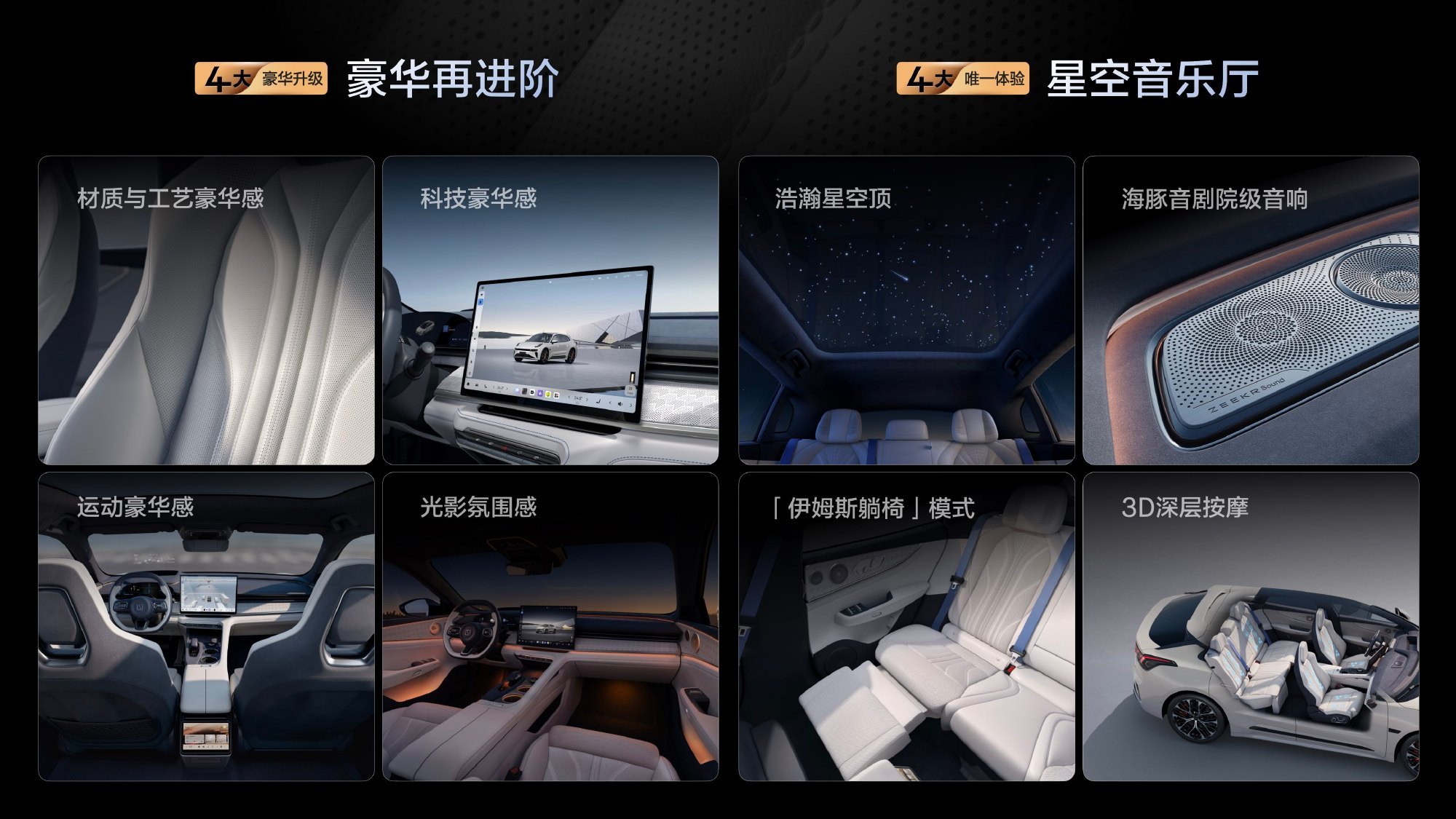 配备256色氛围灯,支持双色渐变与多主题动态光效,可联动驾驶模式、音乐律动与安全预警功能(如 DOW 开门警示),还具备扬声器光幕效果;搭载 ZEEKR Sound Max 海豚音剧院级音响,峰值功率高达 4680W,系统包含 29 个扬声器、8 个头枕音响与 8 个座椅振子,结合 7.1.4.8 全景声布局与杜比全景声技术;可选装浩瀚星空顶(拥有 500 颗独立星光、3 条流星轨迹)与行业首创的水墨色 LV 分区调光天幕,能有效隔绝紫外线,同时新增智能星空天幕配置,提升内饰豪华感与实用性。
