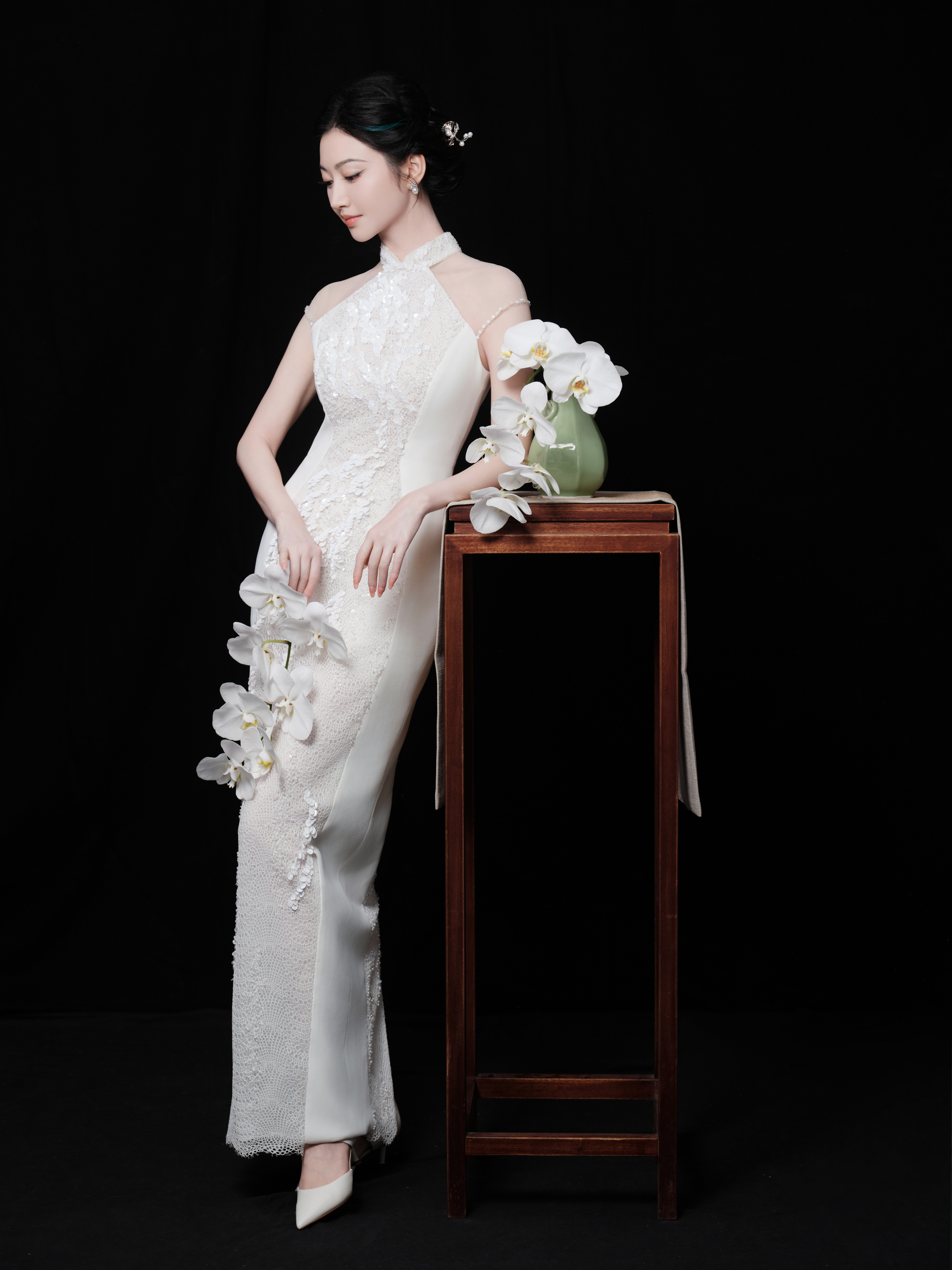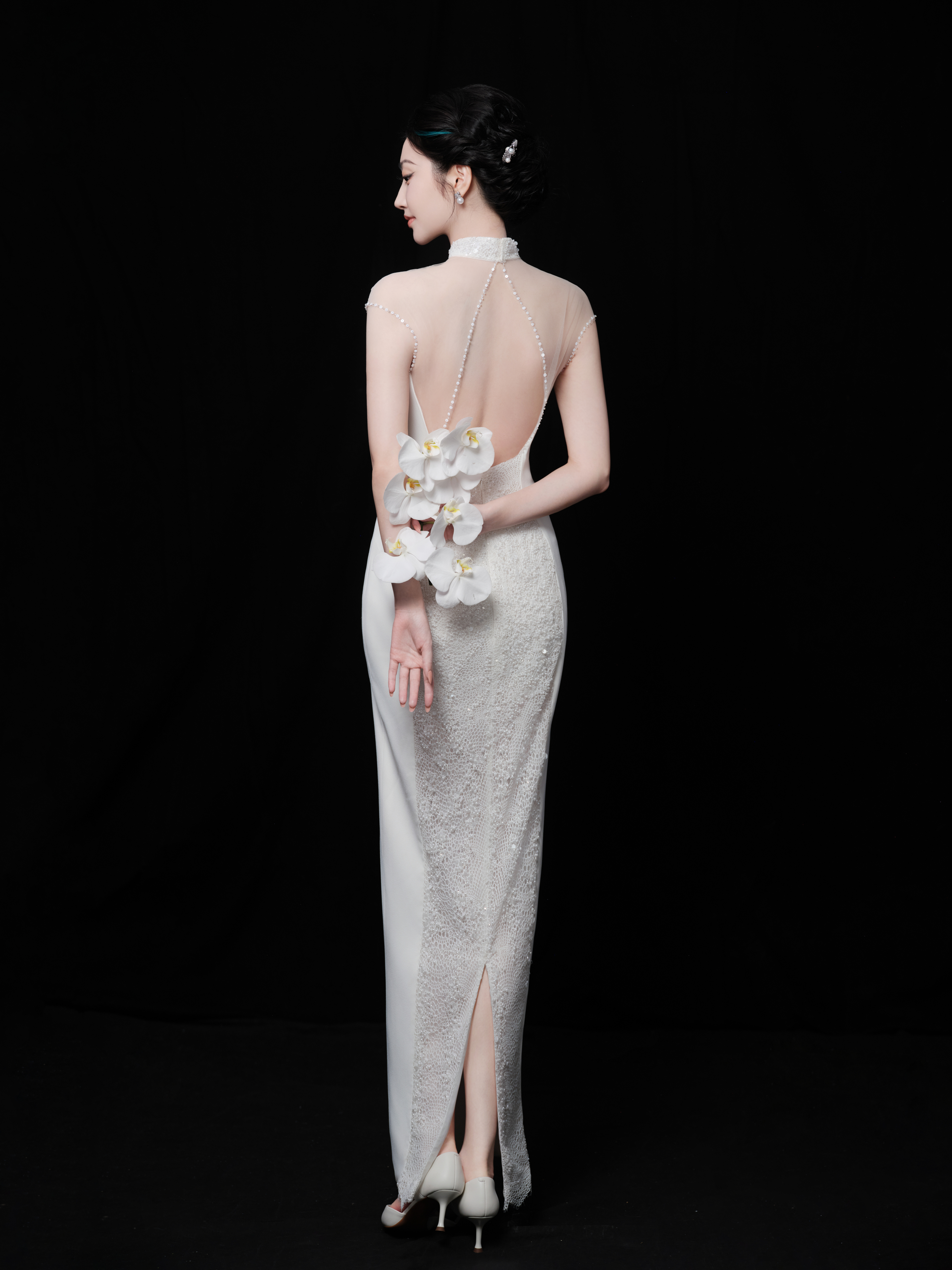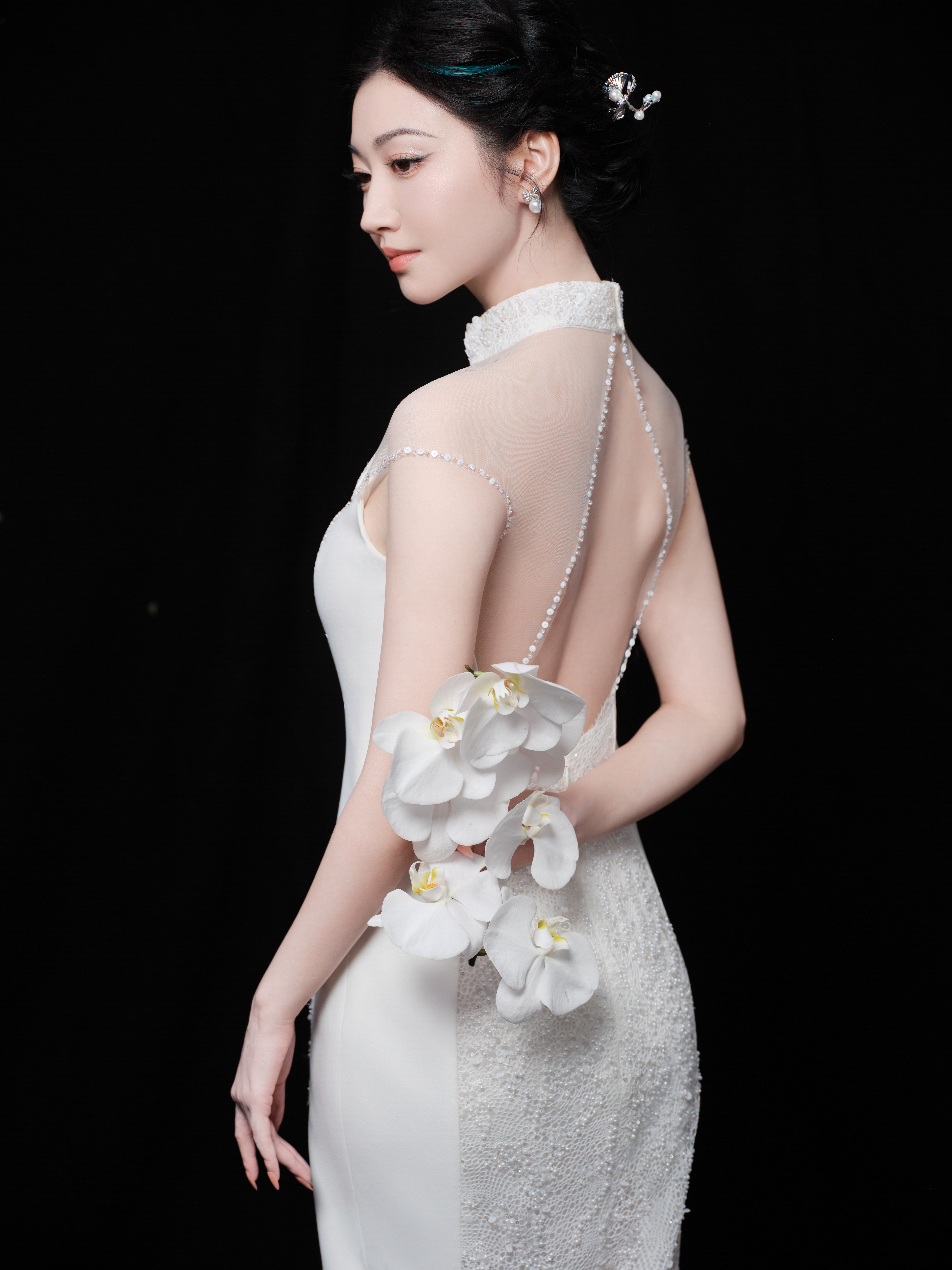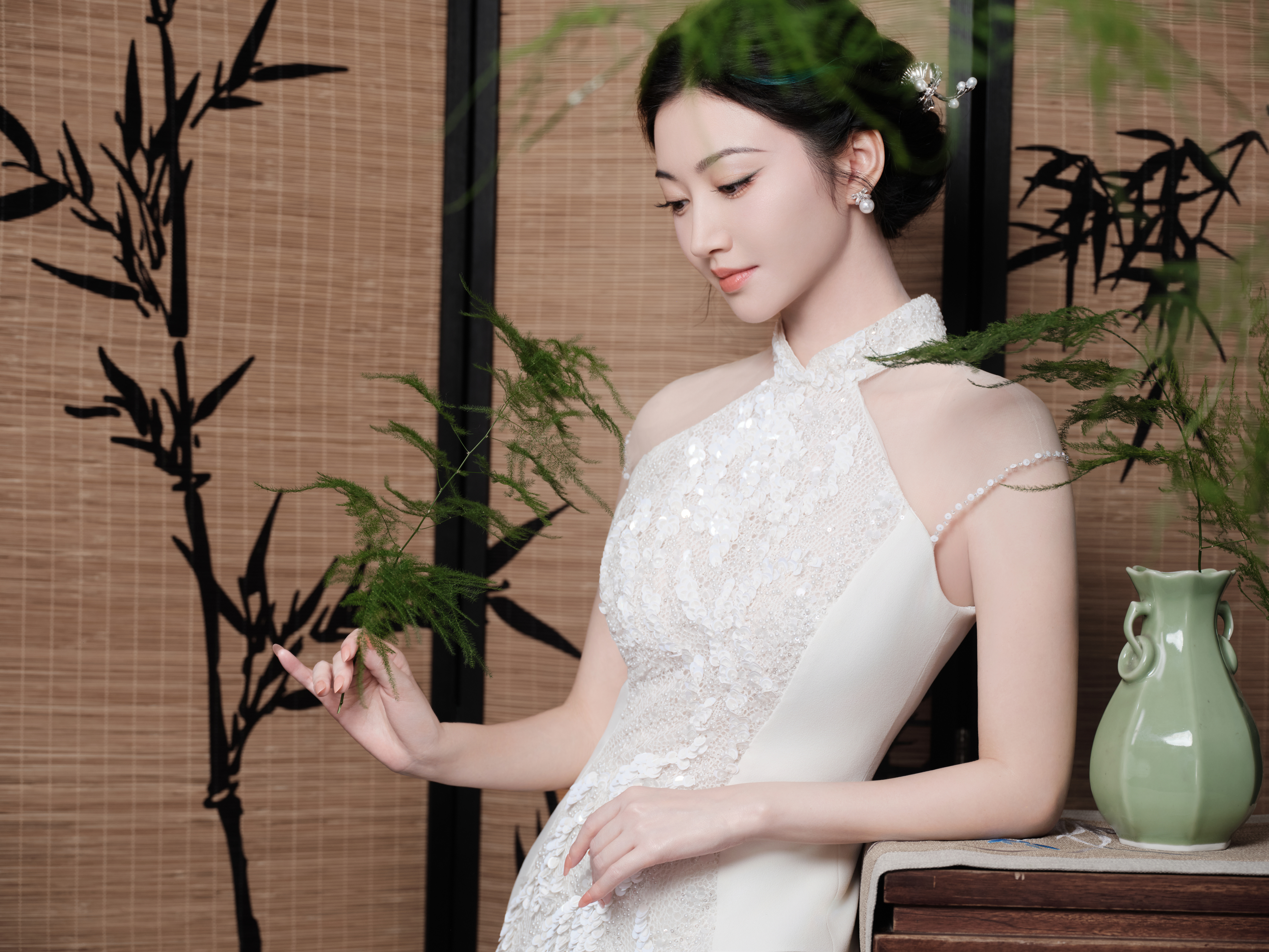 景甜 当月光白的旗袍如流水般裹住曲线,那片网纱轻覆的玉背,是东方美学最撩人的留白。