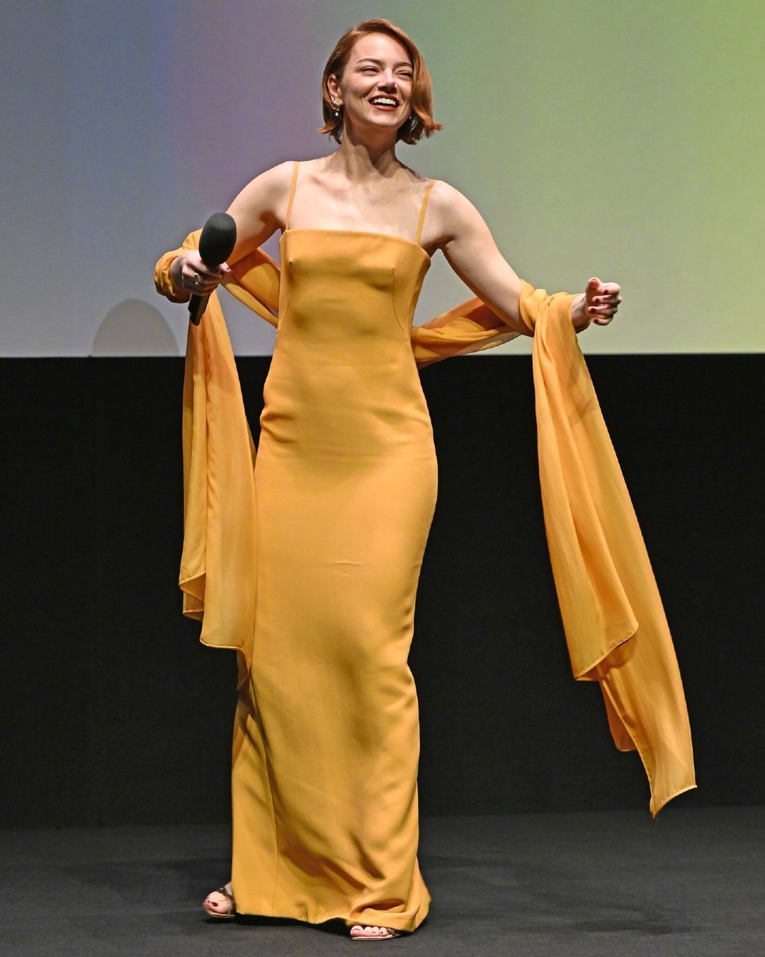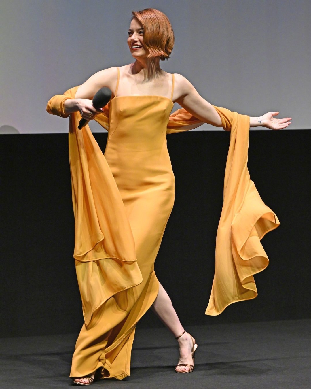 EmmaStone携新作Bugonia亮相伦敦电影节,今天的明黄色长裙依然来