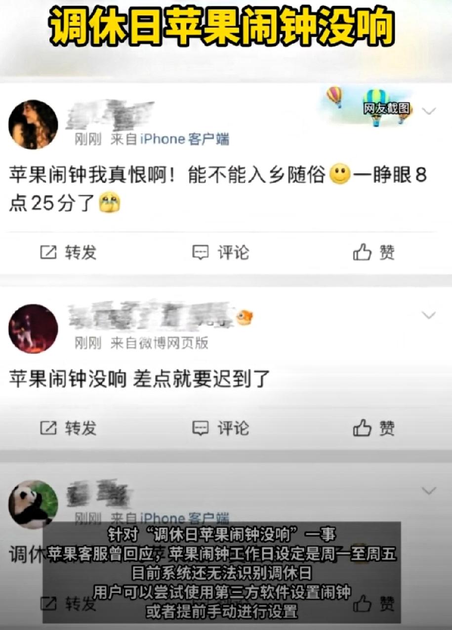 “上班睡过头了!” 今天调休日,结果苹果闹钟却没响, 客服回应说目前系统无法识别,需要手动设置。 谁懂啊!周六调休早起要上班,结果苹果闹钟直接“罢工”,多少人顶着黑眼圈在工位上吐槽? 10月11日这波“闹钟失灵潮”,本质上暴露了苹果系统对咱们“调休文化”的适配盲区——默认周一到周五响铃,却读不懂周末要补班的“打工人规则”。 客服说暂时没法识别调休,只能手动设置或用第三方软件,这话听着实在无奈。 明明是为了方便生活的智能设备,偏偏在最需要靠谱的时候掉链子,说到底还是没真正贴合国内用户的日常节奏。 毕竟对打工人来说,闹钟不是简单的提醒,是避免扣工资的“生命线”,系统多花点心思适配特殊日期,这点比啥都强。 你们这次调休有没有被苹果闹钟坑到?或者有啥靠谱的闹钟替代方案,评论区赶紧分享下,帮更多人避坑!苹果时间