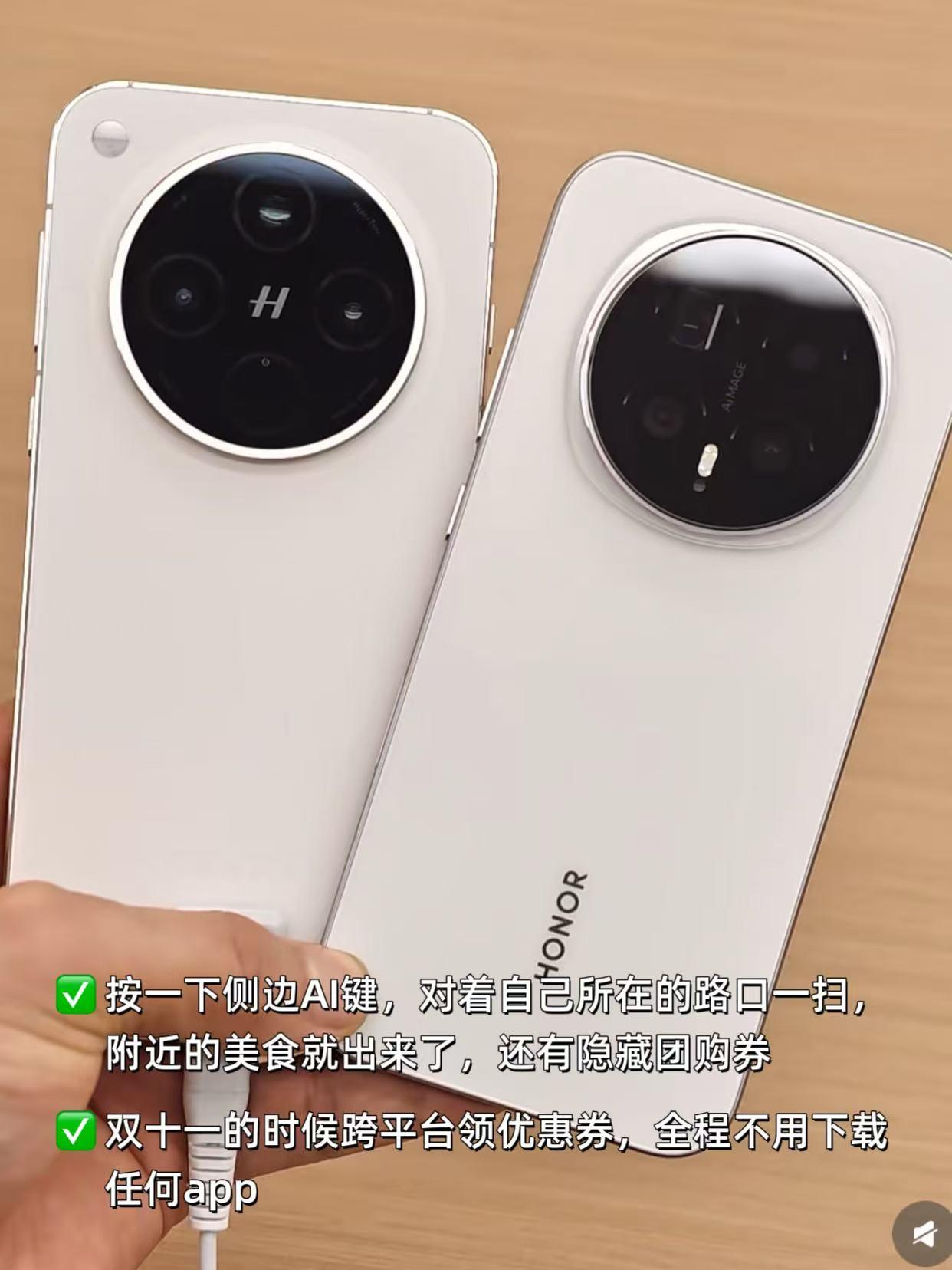 荣耀 Magic8 你比邪修还邪修!逛吃修图全拿捏 宝子们,别再被那些""伪AI""手机忽悠了,真正的AI手机得向荣耀Magic8看齐,这款手机的AI配置非常哇塞,逛美食街不知道要吃啥时按下侧边AI键,对着街口地标一扫,高分馆子清单秒加载,闭眼冲都不踩雷,看中哪家店,扫一下门店就能扒出隐藏团购券,性价比直接拉满,吃到惊艳的宝藏铺,扫个打卡牌,大众点评自动收藏,下次直奔主题 YOYO智能体在不需要下载任何app的情况下可以双十一跨平台领优惠券,自动组合最优惠的方案 拍照这次搭载了2亿像素、超强防抖和AI追色,拍的照片画质清晰,AI追色一键复刻光影大片,灰色天空也一键就能调成天空蓝,小白也整出氛围感大片 支持全品牌互联,和朋友聚会拍照轻松分享,苹果也能无痛换机、配置真的不错,就连网红老王在中国在生日的时候要送粉丝的手机也是这款,估计不少小姐姐都在蹲,你们觉得呢。数码 手机