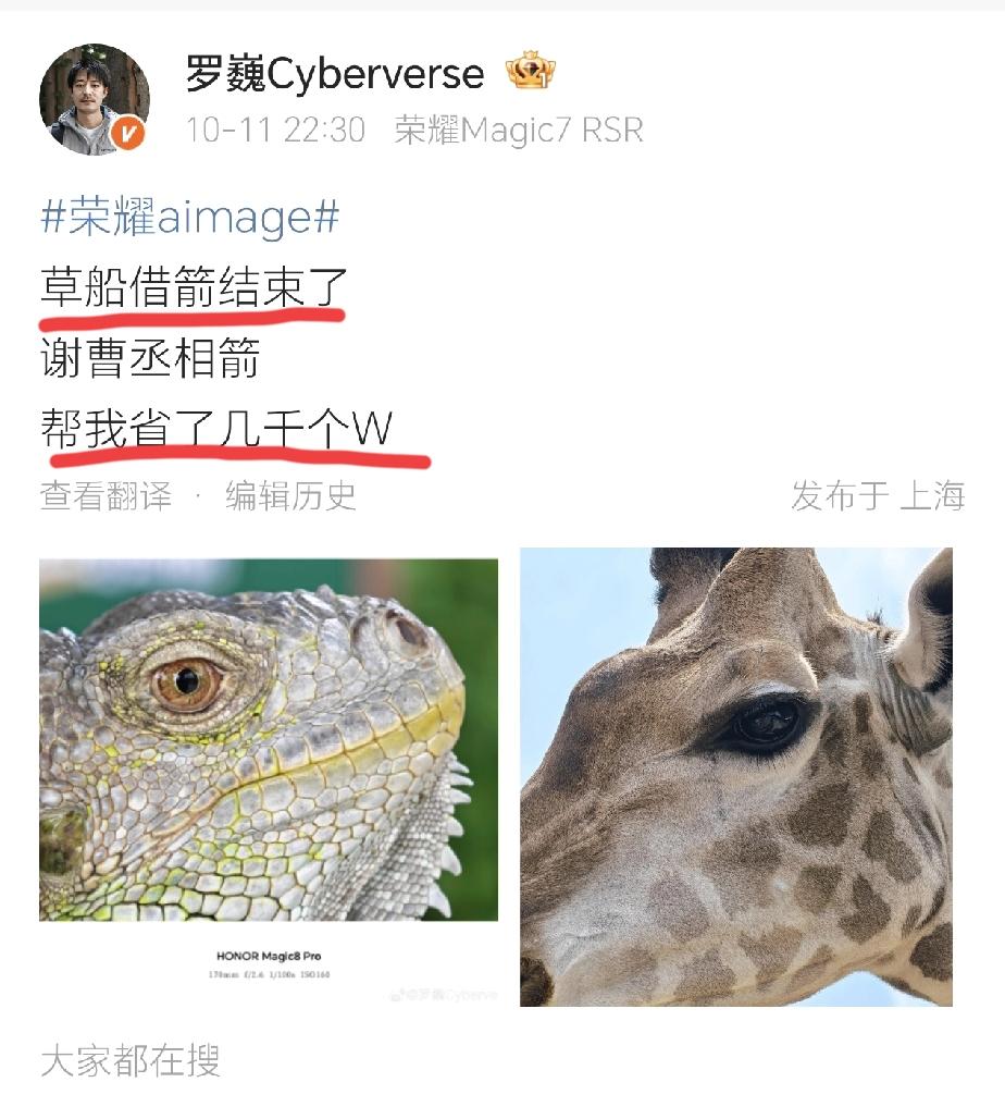 荣耀这一招实在是高!表面是荣耀影像工程师发荣耀Magic8 Pro拍的很烂的照片自嗨,导致网友狂喷,实则也是炒热度省营销费的“骚操作”[捂脸] 说实话,从很多实拍表现来看,荣耀Magic8 Pro的成像表现对得起大家的期待,不过这种反向营销提热度也是无奈之举,不过事实证明,这一次荣耀影像工程师赌对了,好一个“草船借箭”[笑哭]