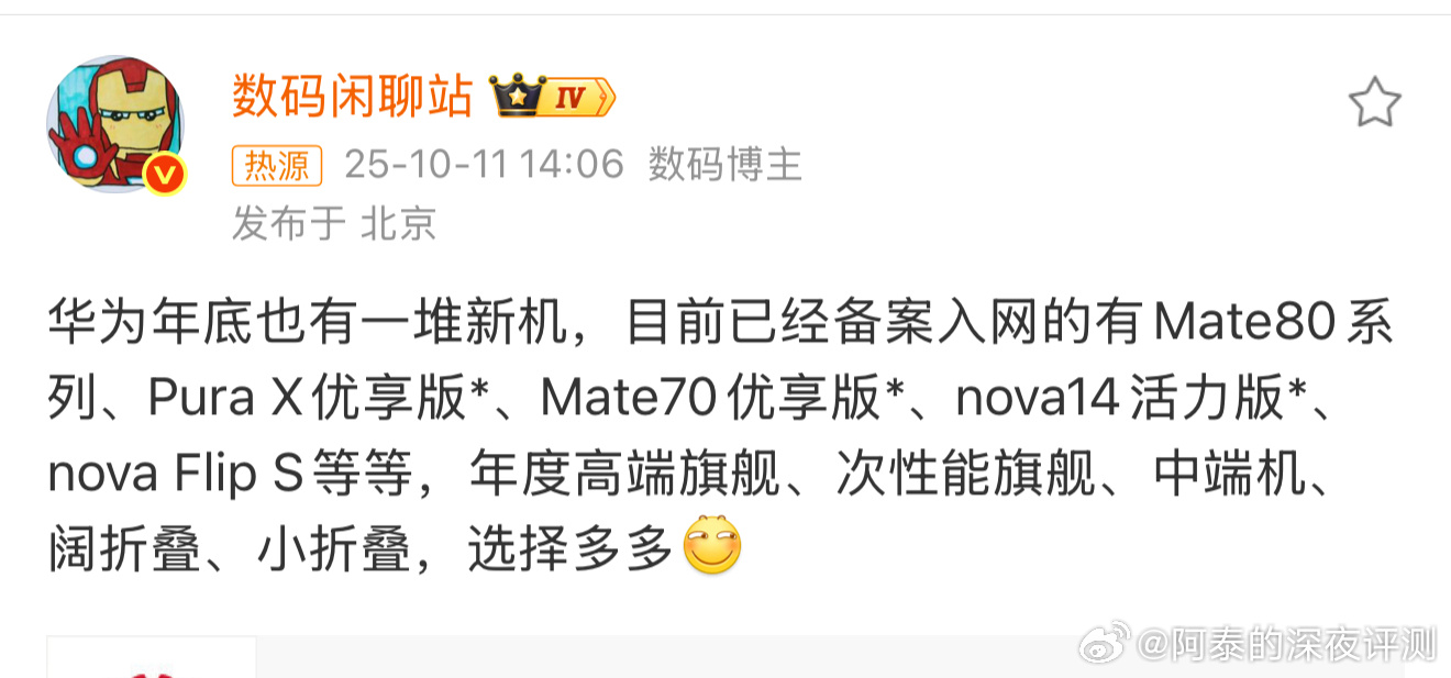 华为年底也有一堆新机周末了,随便聊聊,iPhone 新机发布了,安卓旗舰陆续发布,华为鸿蒙的一大波新品蓄势待发,可选择的非常多,Mate80 系列综合旗舰,还有大折叠,阔折叠,小折叠,中端机等等,应该是属于量大管饱!!总之年底可以好好的期待一波[doge][羞嗒嗒]
