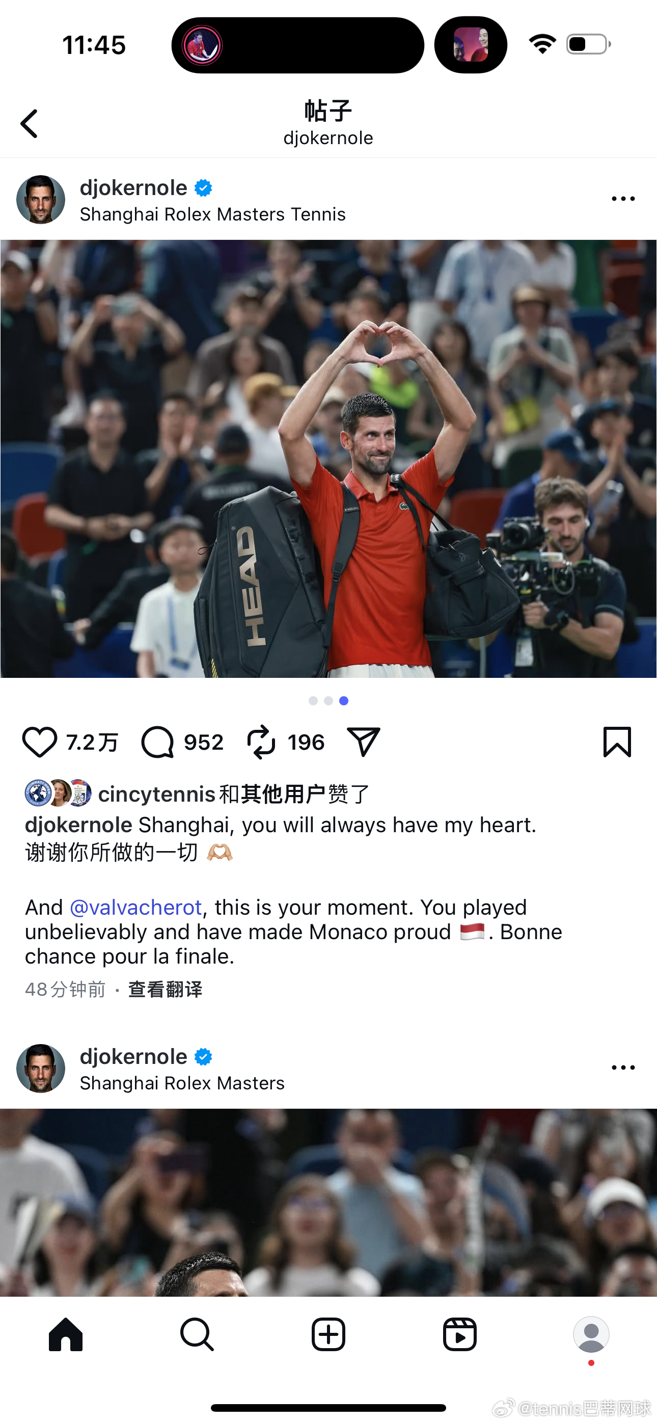 德约科维奇发ins告别上海,鼓励瓦舍罗