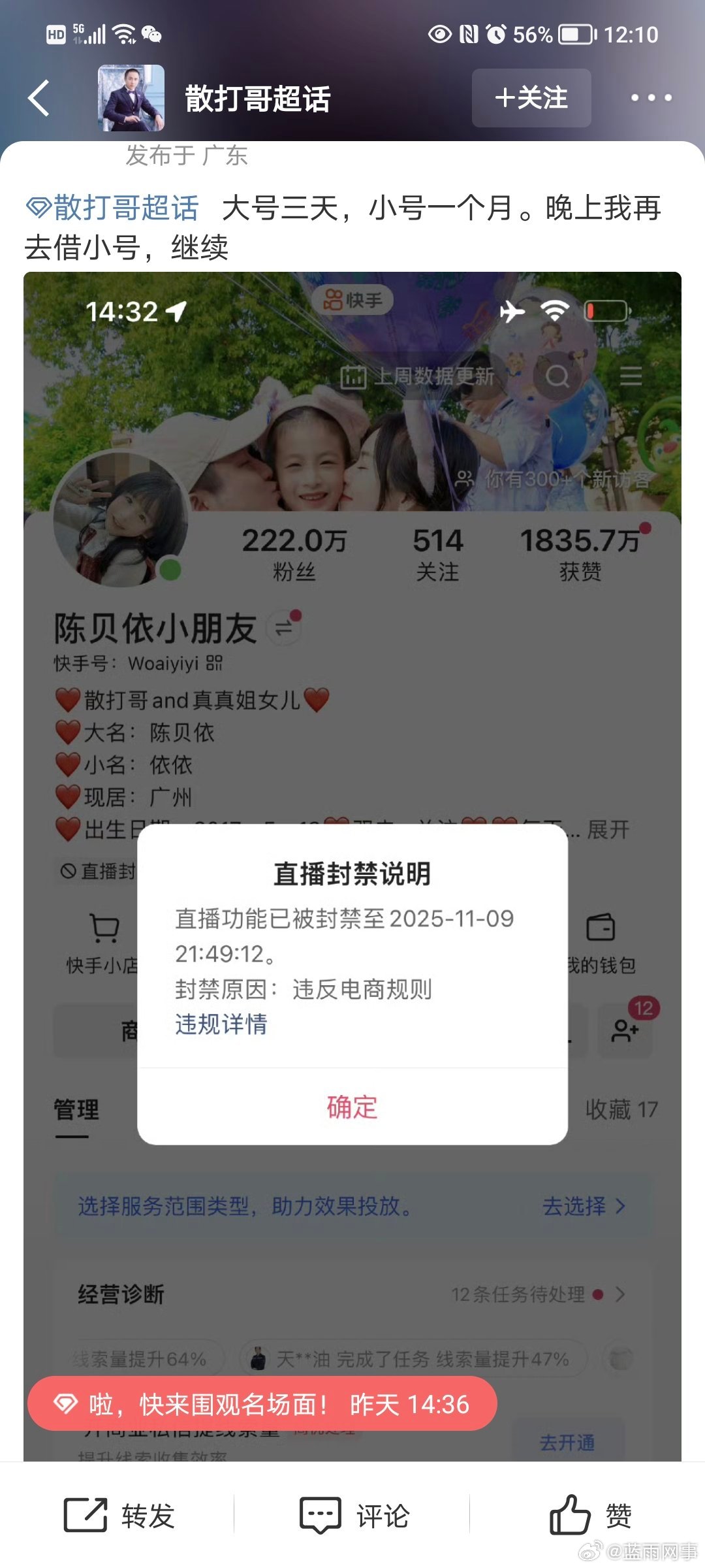 散打哥自曝被封时间大号三天,小号一个月!