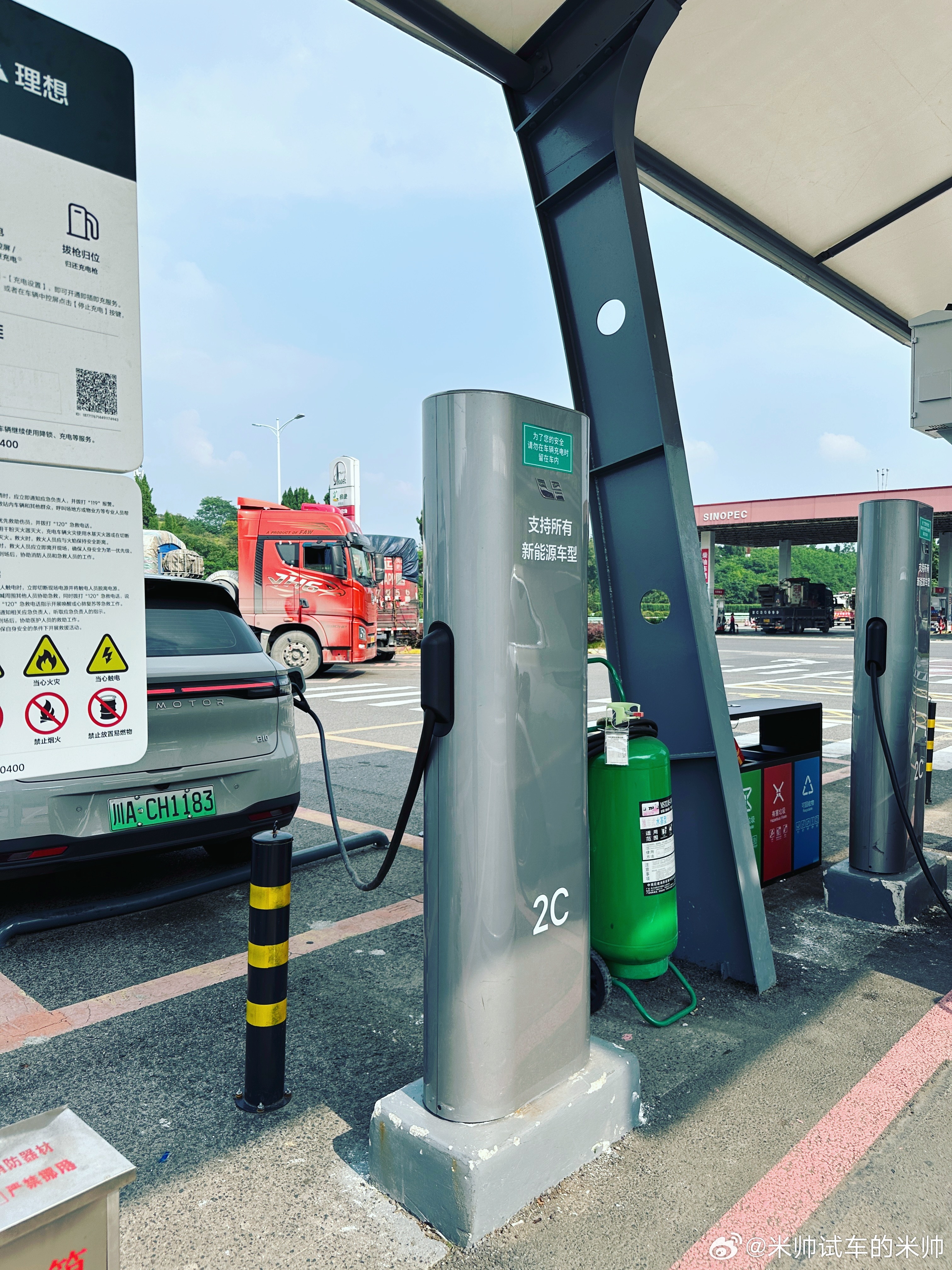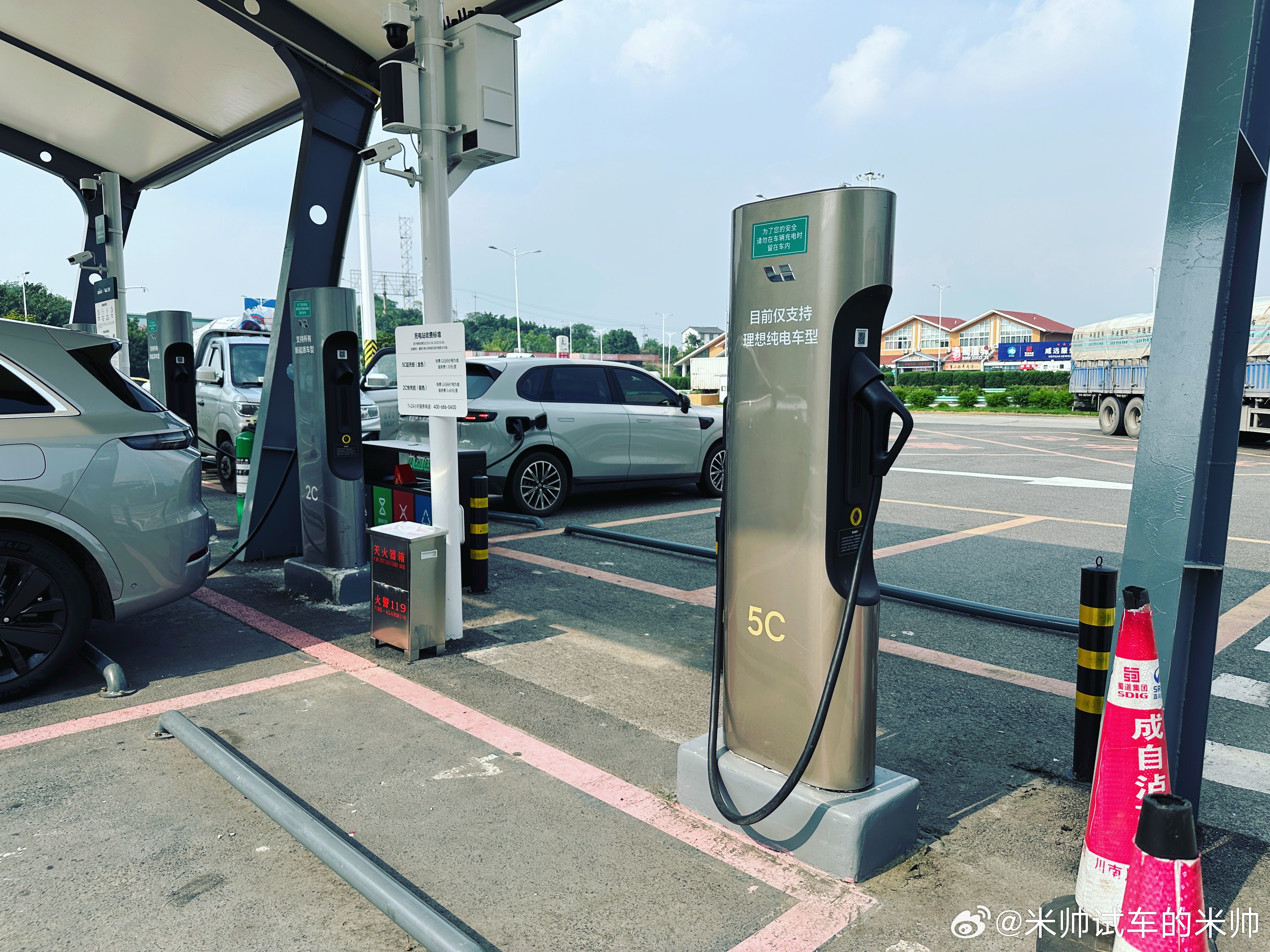 而且理想超充站现在也开放给其他品牌电车了,但是有个小贴士,其他品牌的电车只能用银色的2C充电桩,最大充电功率250千瓦,这也挺大了。金色的5C桩目前只能理想纯电系的车使用,最大充电功率520千瓦!