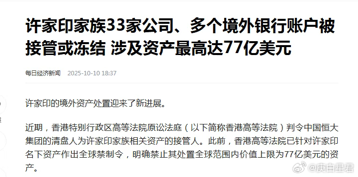 3,境外公司的银行账户。许家印一家人除了在国内有大量的企业之外,在境外的公司也非常多,仅仅是在香港,开曼群岛,维京群岛设立的境外企业就达到33家,这些企业大多都没有实质性的业务,更多的是用来转移国内的资产而已。如今这些资产已经被清盘人接手,部分银行账户已经被冻结,包括许家印个人名下的中国银行(香港)、汇丰银行、星展银行的账户,境外公司所持有的4个工商银行的账户目前已经被冻结。