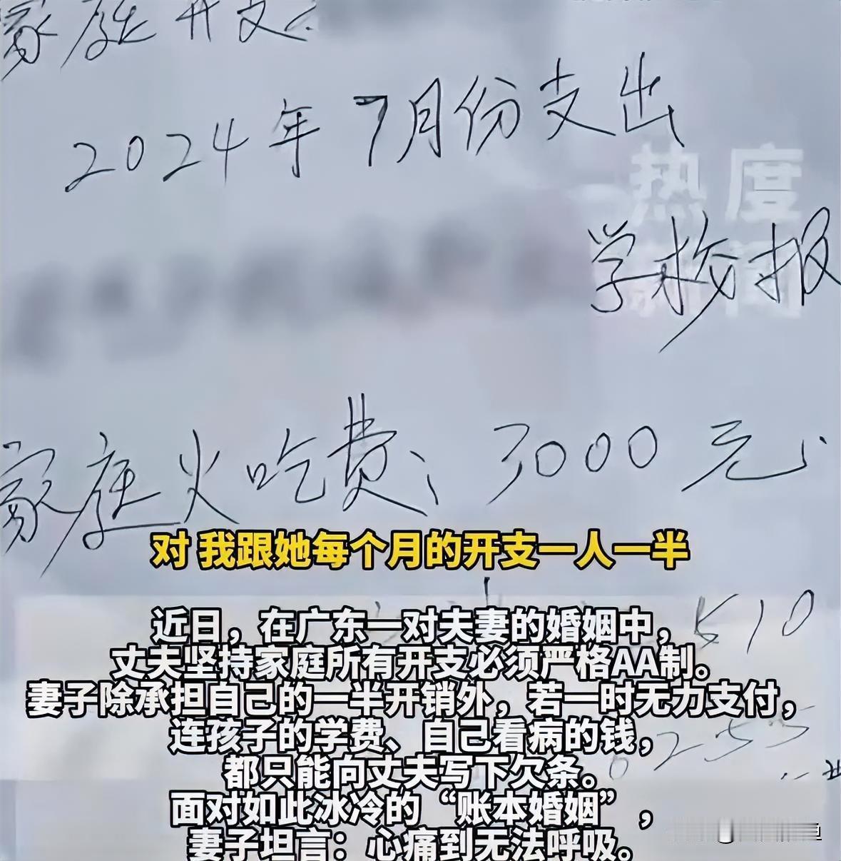 A制婚姻让人难以理解 看到广东这对夫妻的事,我心里堵得难受。那位丈夫,真把AA制当成了不可触碰的铁律,一分一厘都算得死清。最让我揪心的是——妻子连给孩子交学费、自己看病的救命钱,一时拿不出,居然得给丈夫写欠条! 这还算夫妻吗?那句“心痛到无法呼吸”,透着刺骨的寒意。 这哪还像个家?分明是变了质的“拼婚”! 俩人像合租的室友,柴米油盐、养娃看病,桩桩件件都要掰扯清楚。当生活只剩下冰冷的算计,婚姻里最珍贵的相濡以沫、互相扶持,还剩什么? 学费要赊、看病要欠,这样的婚姻,意义何在?数字越算越清,人心的温度,却冷透了。