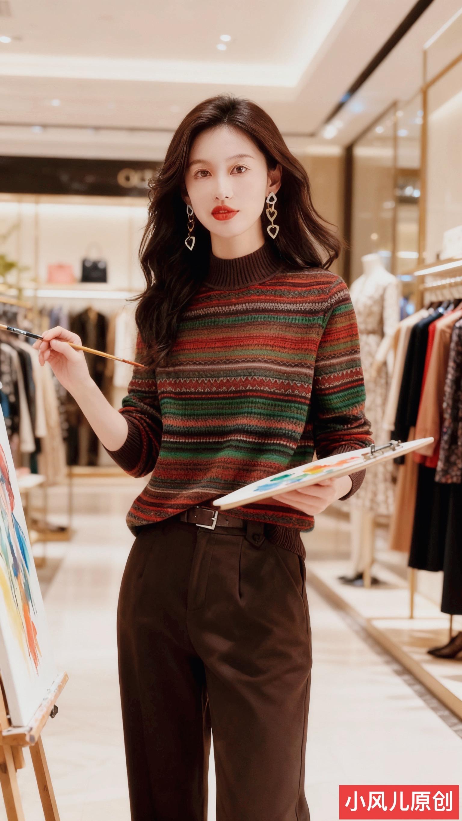 时尚条纹保暖毛衣。秋日橱窗前,落叶点缀、鲜花玩偶与棉拖鞋营造出温暖闲适的秋意; 明亮雅致的购物环境尽显精致; 欧式白柜旁,玫瑰与相框衬出优雅温馨的午后氛围。 人物整体心情松弛愉悦,尽显温柔从容。 复古条纹配色适配秋冬,半高领保暖又显气质,针织纹理精致有质感,版型修身不紧绷,适配多种场景穿搭,兼具美观与实穿性。 你觉得这组图里哪个场景的氛围最戳你呢?