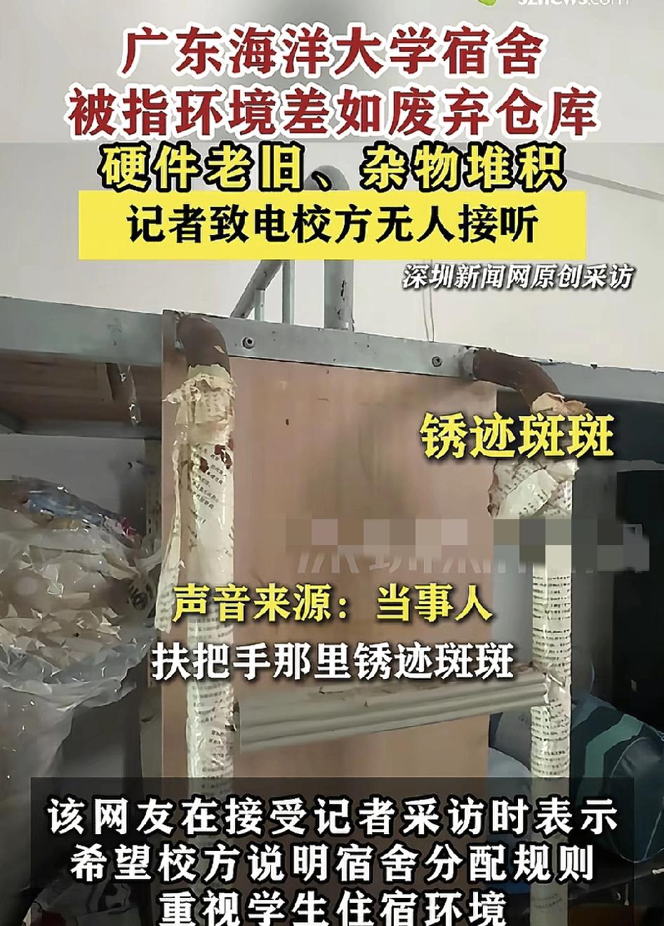 广东海洋大学湖光校区有学生反映自己住进每年1700元的宿舍,但是里面的硬件设施非常陈旧,杂物乱堆放。铁床也是锈你斑斑,上下床很容易被划伤。她希望学校给出分配宿舍的规则,如果是因为价钱便宜,她宁愿选择更贵的宿舍。这些宿舍已经跨过了很多届的学生也该好好的修复了。这么陈旧的铁船,万一真的划伤学生,甚至是有掉落的风险。
