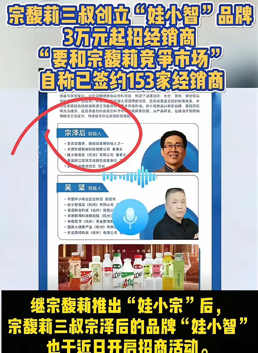 宗氏家族的娃小智品牌来了,这回更加热闹!! 宗馥莉辞职,创立了娃小宗品牌; 彻底跟娃哈哈品牌割裂了,独立自主开始了新品牌的创业; 与此同时,娃哈哈集团也通知了经商,不得代理娃小宗发任何产品; 否则取消经销商资格。 就在这个时候,宗馥莉的叔叔加入和战局; 他注册的娃小智品牌开始全国招商; 只要3万块就可以成为娃小智的经销商; 首场全国招商会已经在杭州召开了。 宗泽后表示,他就是要跟他的亲侄女较量一番; 目前已经招募到153个经销商。 饮料业的大战即将开始,娃哈哈还能继续辉煌; 还是宗馥莉独立之后的娃小宗要逆袭突破; 或者打着宗家名义的宗泽后的娃小智能占据一席之地; 感觉饮料行业天下大乱了,到底谁能笑到最后,我们拭目以待吧。