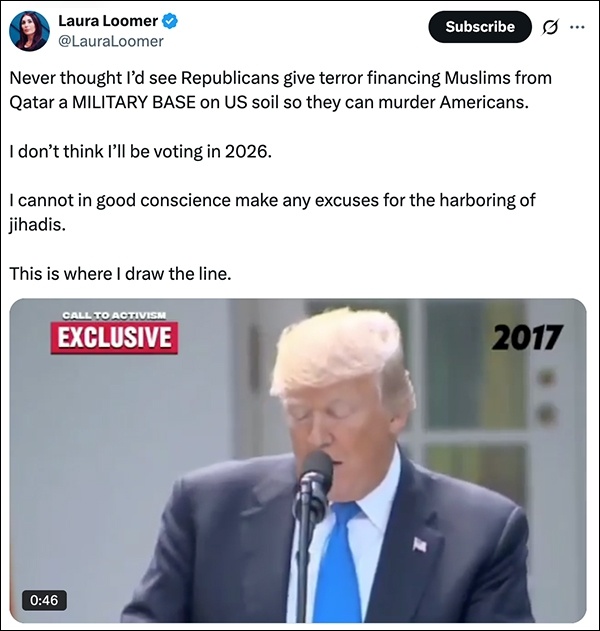 美国《国会山报》、英国路透社等媒体当天报道称,消息一经公布,立即引发了特朗普阵营内最亲近盟友的愤怒与批评,极右翼网红劳拉·卢默认定该计划意味着“卡塔尔要在美国领土上建军事基地”,并直言感到“被背叛”,这件事可能会让她在2026年选择不投票。