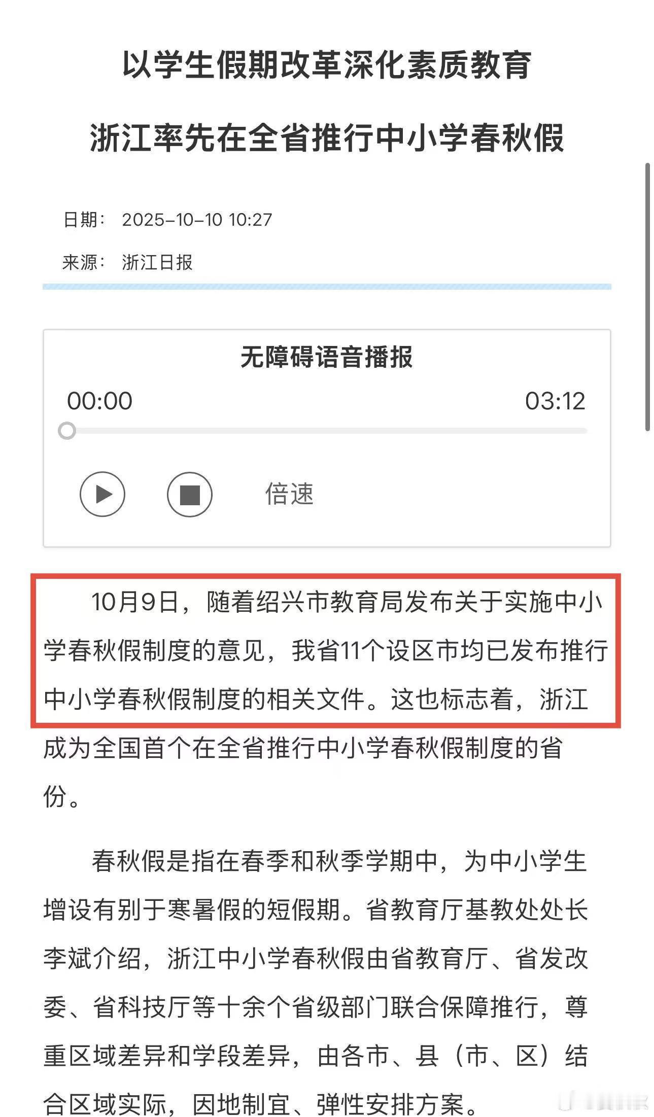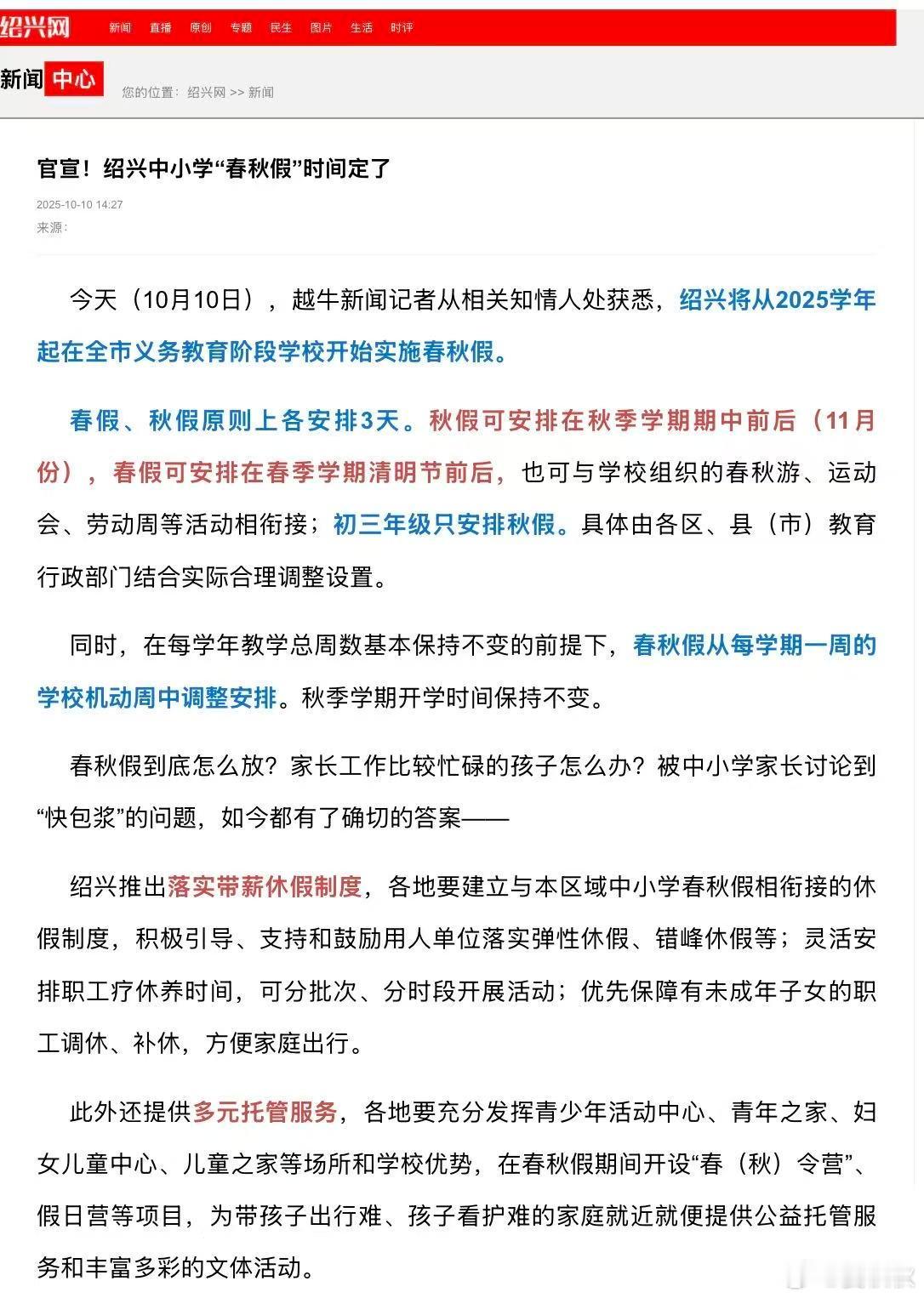 10月9日,绍兴市教育局正式官宣,实施中小学春秋假制度。浙江省11个设区市,均已发布推行中小学春秋假制度的相关文件,覆盖了600多万名中小学生。