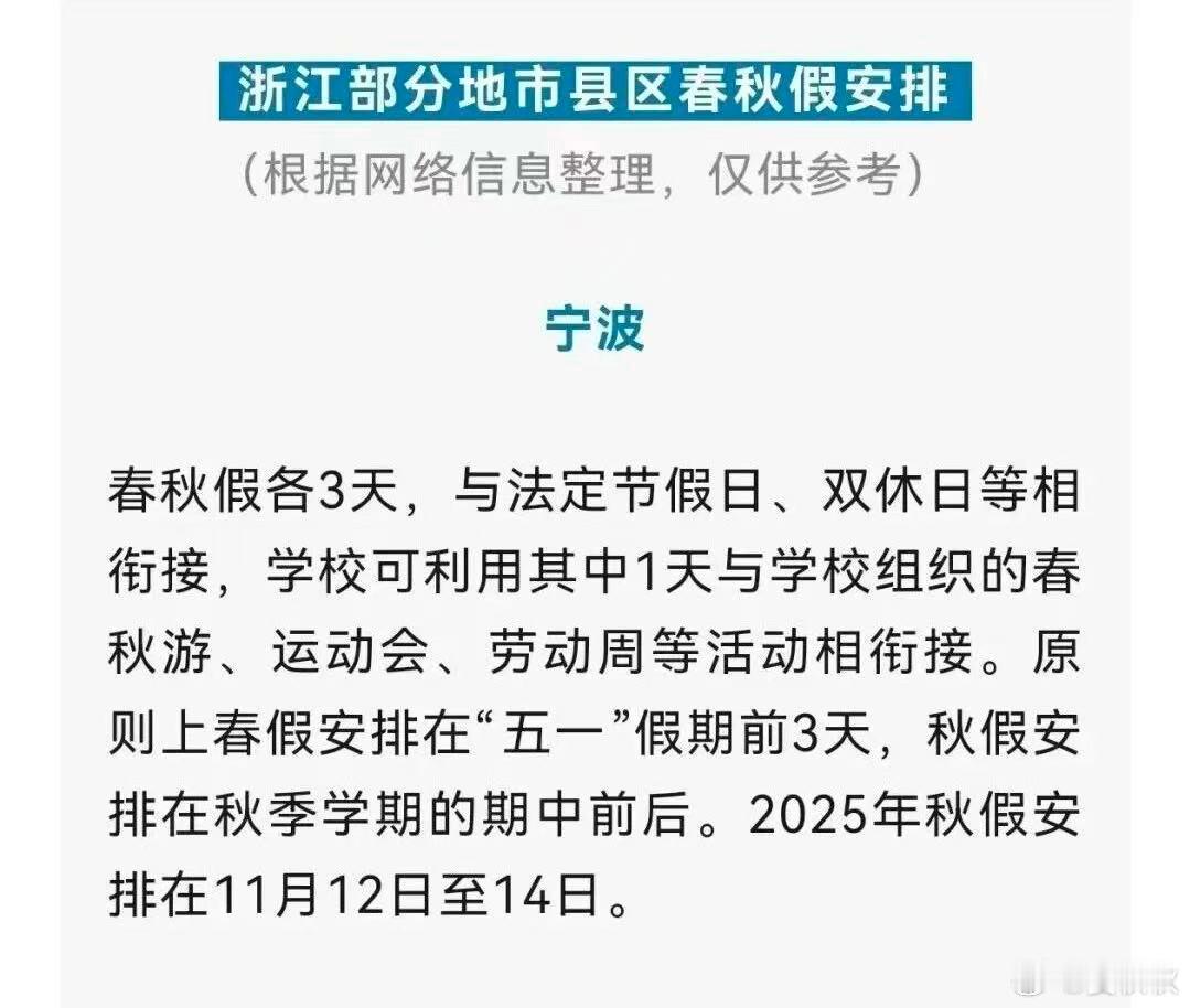 以秋假为例,绝大多数设区市安排在11月的不同时间,与周末相连,形成5天假期:宁波的秋假安排在11月12至14日,衢州为11月19至21日,温州则将秋假定在11月期中考后,具体时间由各县(市、区)定。
