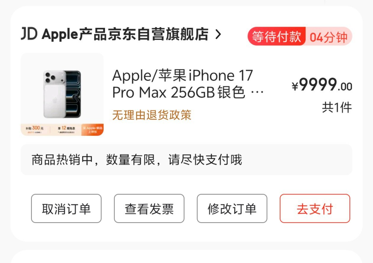 iPhone17ProMax已经现货了,随便买,不过就是不知道双十一会不会破价,正常来说,今年双十一应该稳扎稳打,不会破价,但是保不齐第三方会有一些促销