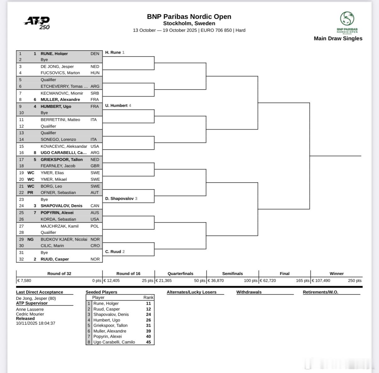 🎾斯德哥尔摩:鲁内、鲁德、沙波瓦洛夫、恩贝尔位列前四种子。