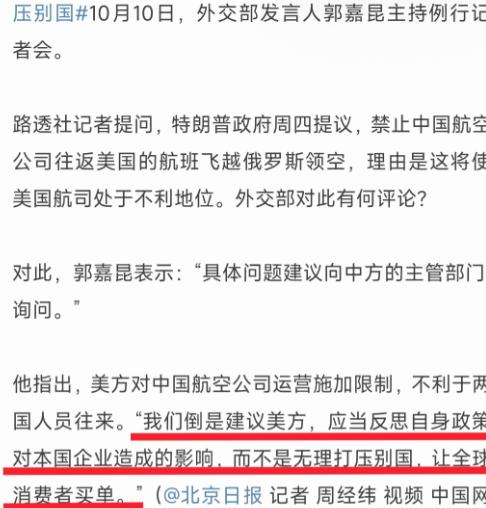 特朗普要禁止中国航班飞越俄罗斯领空,外交部提了个“建议” 美方给出的理由听着就离谱,说自从俄乌冲突爆发后,他们自己禁止美国航司飞越俄罗斯领空,结果美国飞机飞跨洋航线得绕远路,最远的时候要多绕几千公里。 可中国航司没这限制,能走俄罗斯领空的“近道”,运营成本低,竞争力就比美国航司强。为了让美国企业能“公平竞争”,就得给中国航司加限制。这话听得人直皱眉,合着自己选的路,走得累了倒要怪别人走了近路? 先说说这所谓的“近道”到底差在哪儿。就拿中美航线来说,上海飞纽约,中国航司走俄罗斯上空13个半小时就能到,美国航司得绕着太平洋飞,硬生生多耗一个半小时到俩小时。 别小看这俩小时,对航空公司来说全是真金白银的损失。航空数据算过,绕飞一趟得多烧10%到20%的油,光人力成本就得多花600到750美元,一年下来美国航司光利润就蒸发20亿美元,美国航空运输协会自己都承认,就因为绕路,美国航司每年得丢20亿美元的市场份额。 更别说有些航线根本没法开,比如美国东海岸直飞中国的航班,因为绕路太费钱,经济上根本不划算,只能眼睁睁看着机会溜走。 可这事儿能怪中国吗?完全是美国自己的政策闹的。2022年俄乌冲突升级后,是美国先禁止俄罗斯航司飞越美国领空,俄罗斯才反制不让美国航司进自己领空的,这是典型的“自作自受”。 中国从头到尾没参与这种互相禁飞的博弈,中俄之间的航权一直正常,中国航司能走俄罗斯领空,是合规合法的,既没违反国际法,也没损害谁的利益。 反倒因为这,中国航司还填补了西方航司留下的空缺,2024年中国三大航司往返中国和西欧的客运量比2019年还高了18%,飞往英国、西班牙这些国家的航班增幅都在25%到45%之间。 更实在的是,中国航司的成本优势最终惠及的是全球消费者。因为路程短、成本低,中国航司的票价能比欧洲航司便宜5%到35%,这对经常往返中美、中欧的旅客来说,真是实实在在的好处。 可美国现在要禁止中国航司走近道,说白了就是要把自己政策造成的成本转嫁到消费者头上,以后大家坐飞机不仅得花更多钱,还得耗更长时间,这哪儿是追求“公平”,分明是让全球人给美国的任性买单。 面对这种离谱的提议,中国外交部很快就给出了回应,发言人郭嘉昆的话算是点透了问题的本质。他直接指出美方这么做不利于两国人员往来,还特意给美方提了个“建议”,让他们好好反思自身政策,别总是无理打压别国,更别让全球消费者为美国政府的任性埋单。 这话真是说到了点子上,美国航司现在的困境,根源是自己的制裁政策,不去改自己的政策,反倒拿中国航司开刀,这逻辑根本站不住脚。 其实这事儿早有苗头,去年4月美国航司就联名给政府写信,要求暂停增加中美航班,理由也是所谓的“反竞争”。2023年美国同意把中国赴美航班从每周8班加到12班,还附了个条件,要求中国航班不能飞越俄罗斯领空,结果导致中美航线恢复的谈判一直卡着。现在特朗普政府干脆直接下通牒,说白了就是没辙了,只能靠打压别人来掩盖自己的政策失误。 更值得琢磨的是,这背后可能还有别的算计。现在中美关系本来就紧张,经贸领域的摩擦不少,波音公司还在跟中国谈500架飞机的大订单,美国说不定是想拿航空航线当筹码,在其他问题上给中国施压。 这种把民用航空政治化的做法,根本不是负责任的大国该有的样子。要知道,航空运输讲究的是效率和安全,空域使用也是基于国际民航组织的规则来的,不是谁想限制就能限制的,美国这种单边主义的做法,只会破坏全球航空业的秩序。 再说了,美国要是真这么干,受损的可不只是中国航司。美国自己的旅游业、跨国企业也得受影响,很多美国公司依赖中美之间的便捷交通开展业务,航班成本上升、效率下降,最后还是美国企业自己吃亏。而且这种做法还会引发连锁反应,要是各国都学着美国这样,把空域当政治博弈的工具,全球航空网络非得乱套不可。 欧洲航司之前也抱怨过所谓的“不公平竞争”,汉莎航空甚至停了法兰克福到北京的航线,法航荷航还游说法国政府限制中国航司。可他们忘了,自己的困境也是欧盟跟着美国制裁俄罗斯的结果,同样是自作自受。现在美国想拉着大家一起搞限制,本质上就是霸权心态在作祟,自己搞砸了事情,不想着怎么补救,反倒要拉别人一起下水。 说到底,特朗普政府这波操作根本不是为了什么“公平竞争”,而是典型的双重标准和霸权逻辑。自己定的规矩导致了损失,不反思不修正,反倒去剥夺别人合规合法的权利,这种做法不仅会遭到中国的反对,也会让全球消费者看清美国的真面目。 正如外交部建议的那样,美国真该好好想想,到底是谁在破坏公平,是谁在损害全球利益,与其花心思打压别人,不如赶紧调整自己的错误政策,这才是解决问题的正道。要是真把民用航空当成政治博弈的棋子,最后只会搬起石头砸自己的脚。