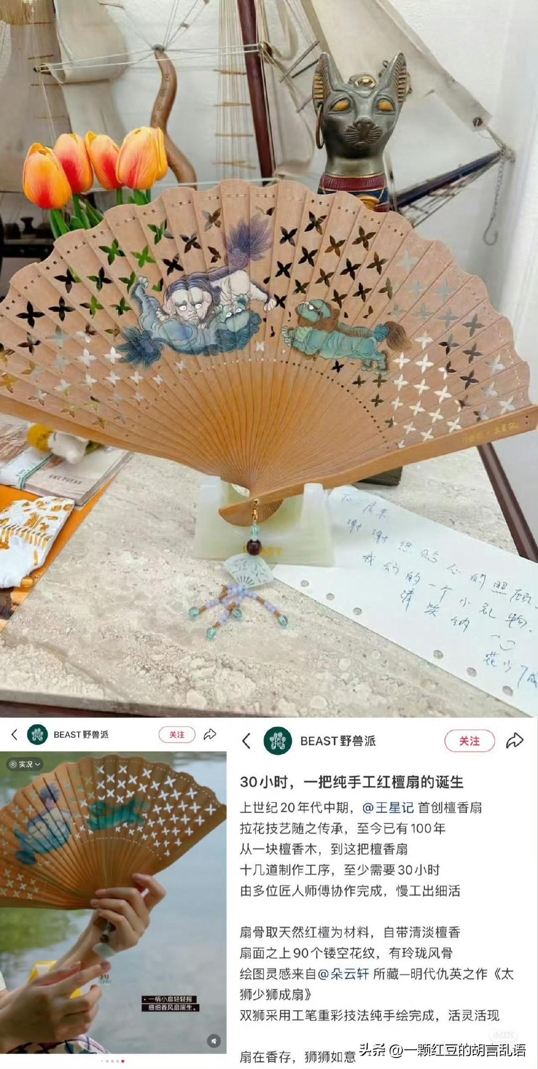 明星就是豪爽啊,才发现原来龚俊在埃及送给房东的扇子,竟然要2688元。 大家还记得花儿与少年在结束埃及的行程时,龚俊说自己留了一个礼物给房东,而且还留了一张小纸条吗? 有网友扒出来,原来这个礼物是野兽派“狮狮如意”红檀香扇,市场价2688。 虽然后面查了一下,发现檀香扇的制作需要经过选料、开料、拉花、烫花、镶嵌等数十道工序,且檀香木本身稀缺(尤其是红檀香),一把纯手工檀香扇的成本本就不低。 理智上能理解 “贵有贵的道理”,但情感上还是会忍不住换算:2888 块,够买好几件换季的衣服了,能请家人吃顿不错的大餐,甚至能添个小型家电…… 只能说明星的消费门槛,果然和普通人的日常不一样。
