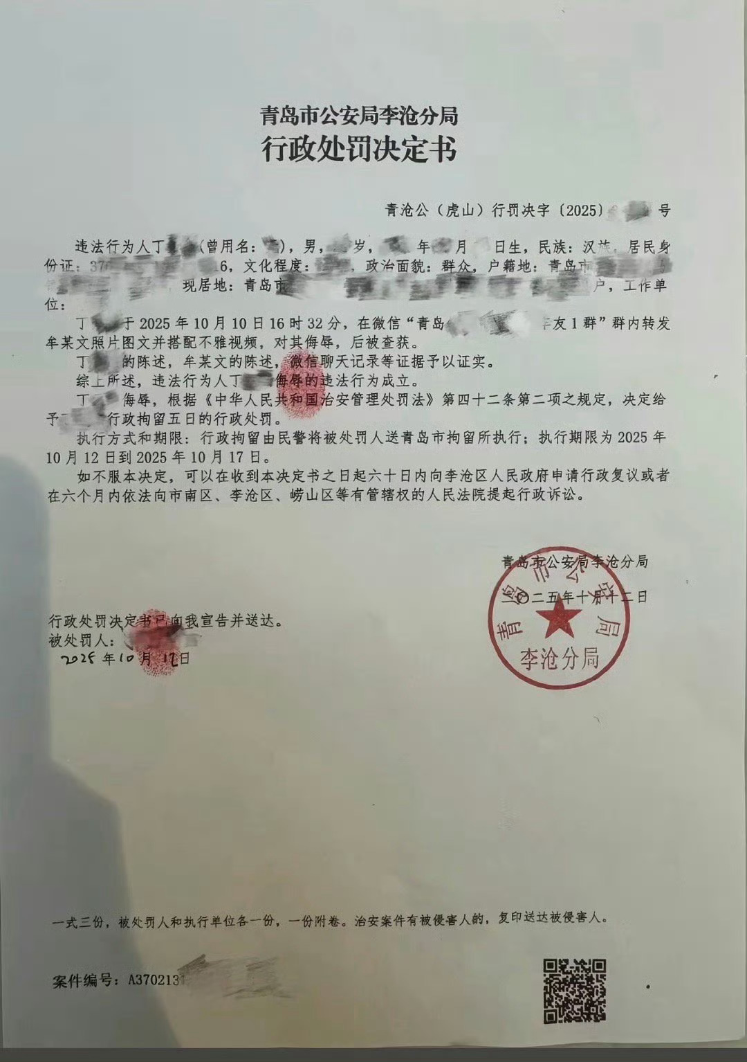 10月12日,青岛保时捷女销冠在社交平台再发文晒出行政处罚决定书,并再次发声明。