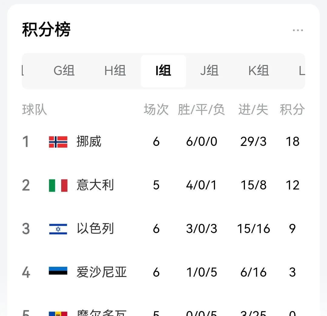 意大利队出线前景不容乐观,意大利想以第一名直接晋级2026美加墨世界杯已经希望渺茫了,挪威队主场5比0大胜以色列队,哈兰德上演帽子戏法,哈兰德太牛啦!哈兰德终于有希望第一次参加世界杯了。 挪威豪取世预赛6连胜,意大利少赛1场积12分排名第2,落后挪威6分,而且意大利与挪威的净胜球差距巨大,挪威的净胜球优势明显,意大利还需要挪威至少输掉两场,同时还要弥补巨大的净胜球差距,这几乎不可能,意大利看样子又要连续第三届通过附加赛来争取世界杯门票了,附加赛单场定胜负,意大利凶多吉少,希望意大利好运吧!