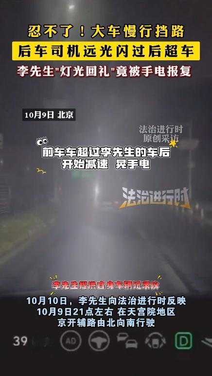 “冤不冤?”10月10日,北京,一男子开车行驶在辅路上,由于前方大车速度较慢,他只能减速跟在后面,可后方司机频繁用远光灯晃他,男子就减速让对方超车,然后也用远光灯晃了几下,没想到,对方又拿出强光手电筒照他!网友:素质堪忧。 10月9日晚上,北京的李先生开车走在辅路上,前面一辆大车开得很慢,他只能跟在后面,这条辅路只有一车道,没法超车,过了一会儿,后面的车开始用远光灯频繁晃他,强光透过后视镜直射眼睛。 李先生减速靠边,示意后车超过去,等对方超到前面后,李先生也开了远光灯闪了几下。结果前车司机从车里拿出一个强光手电筒,对着李先生的脸直接照射。 这个手电筒亮度特别高,比汽车远光灯还刺眼,李先生想超车时,那个司机还把手电筒伸出窗外,追着他的眼睛照,强光照射下,前方路况完全看不清,李先生只能减速避让。 这种事其实挺常见的,晚上开车遇到后车用远光灯晃,很多人第一反应就是回怼,但这样做往往会让事情升级,有些人脾气上来了什么都干得出来,像这次用手电筒照司机,已经严重威胁行车安全了。 远光灯确实让人烦,城市道路、有路灯的地方根本不需要开远光,但总有司机不管不顾,被晃几下就想回击,这种心态能理解,但真不值得,万一对方是个暴脾气,真做出什么过激行为,受伤的还是自己。 遇到这种情况,最好的办法就是让,稍微减速或者靠边,让后车过去就完事了,有些人觉得这样太窝囊,但开车不是争高低的地方,安全回家才是最重要的。 如果后车一直用远光灯跟着,可以打开双闪灯示意一下,或者找个安全的地方靠边停车,等对方走远了再继续开,千万别用远光灯对射,也别急刹车或者故意开慢,这些都可能引发更大冲突。 行车记录仪在这种时候很有用,如果对方行为特别恶劣,记录下来可以向交警反映,现在很多地方都能网上举报违章,上传视频就行,不用自己去找交警。 晚上开车本来视线就差,再遇到远光灯或者强光照射,危险性成倍增加,高速上曾经发生过因为远光灯导致看不清路况,直接撞上护栏的事故,在城市道路上,也可能因为短暂失明撞到行人或者其他车辆。 其实大部分司机并不是故意想惹事,只是一时冲动,但路上的事故往往就发生在这一瞬间的冲动里,控制好情绪,遇到不文明驾驶行为,让一步海阔天空。 有些老司机的经验是,遇到这种情况就当对方是新手,新手开车紧张,可能不知道自己开了远光灯,这样想想,气就消了一大半,当然真遇到故意找茬的,就更没必要理他了,不值得为这种人影响自己的情绪和安全。 “这事儿真是典型的“路怒升级战”!要我说,第一个挑事的肯定是后车司机,辅路本来就一条道,前面有大车开得慢,谁不憋屈?但你闪远光灯催前车有啥用啊,人家李先生也不是故意挡路。” “不过李先生后来反闪那几下远光灯,虽然解气,但也确实冲动了,这不就是“你扔鞭炮,我点煤气罐”嘛!结果对方直接掏强光手电照眼睛,这已经超出斗气范围,简直是危险驾驶了。” “路上吵架顶多上火,照眼睛可是要出人命的! 我猜当时拿手电那哥们儿,车上备着强光手电,估计平时就没少“备战”。” “这种司机总觉得全马路都该给他让道,方向盘一握就像拿了尚方宝剑,网友说素质堪忧真没说错,这素质都快跌穿地板了! 其实这种辅路跟车场景太常见了。” “遇到后车闪灯催,最稳妥的办法是打开双闪提示前车,或者找机会靠边让一下,虽然憋屈但总比惹上这种“光影大战”强。毕竟你永远不知道后车坐的是个路怒症几级选手。 ” 也有网友说李先生冤得很,被闪了还不能还手了? 但说真的,开车不是打擂台,赢了一时之气,可能输了一生平安,对方强光照射那几下,万一导致李先生视线模糊撞到行人,后果谁敢想? 现在很多司机都缺乏“路上共情力”,总觉得别人慢一步就是针对自己。 其实大家无非都是想平安到家,何必把公路当战场?下次遇到类似情况,深呼吸默念“他急我不急”,可能就避免一场冲突。 “强烈建议交规里把强光手电照驾驶员列为危险驾驶行为!这比开远光灯恶劣多了,应该直接扣分罚款。” 如果你是被闪灯的李先生,你会怎么做?是选择忍让还是反击?有没有类似经历的老司机来支个招? 信源:法治进行时