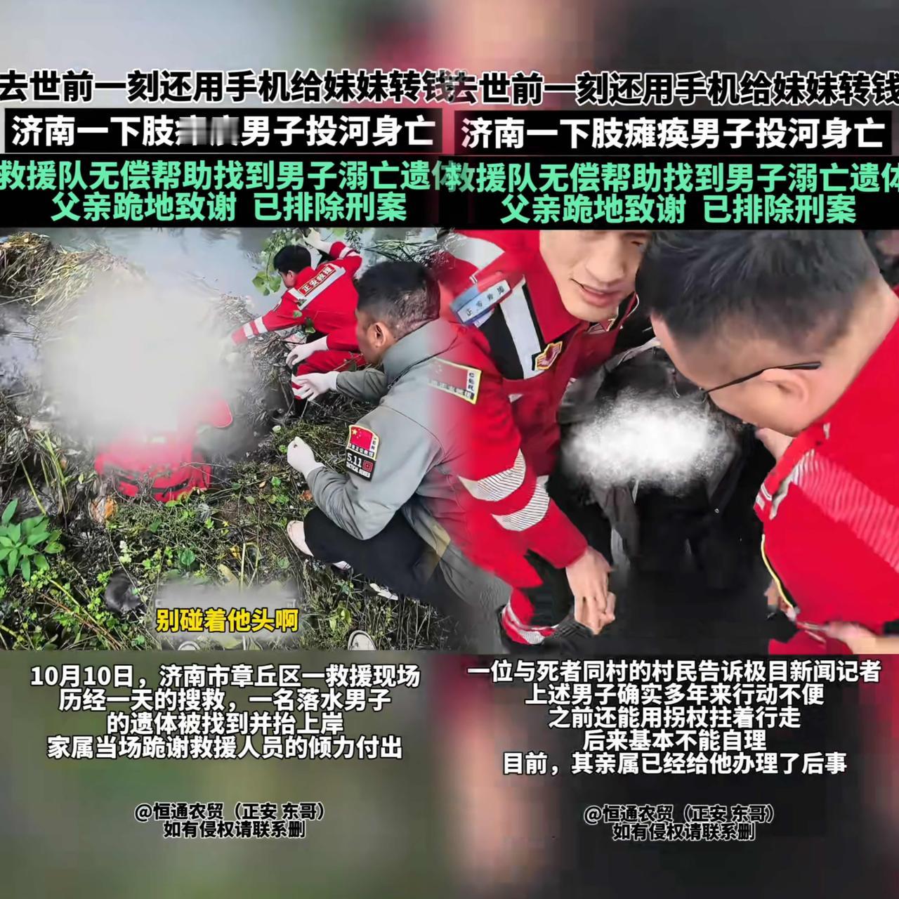 研究完这名投河男子的故事 心里像压了块石头。 他投河前把手机里的钱全转给了妹妹,自己本就是残疾人,最近彻底瘫痪,吃喝拉撒全靠父母照顾。 他说不出“不想活了”,却用行动做了最狠的决定——不想再拖累年迈的父母,活着没尊严,不如“解脱”。 有人骂他“懦弱”,可换作谁,每天躺在床上等饭吃,连翻身都要人帮,这种“活着”的滋味,比死更煎熬吧?他的选择,是绝望里的最后“体面”。 但我想说,生命从不是一个人的事。父母照料他,或许累,却也是爱的延续;他选择离开,看似“为父母好”,却成了他们一辈子的痛。 如果换作你,会怎么选?评论区聊聊,你的答案,或许能帮更多人看见:活着再难,也别独自扛下所有。