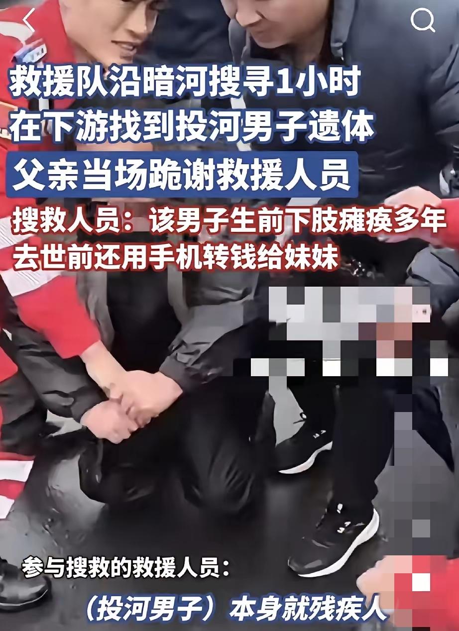 看完这个投河男子的故事,我沉默了很久。 表面上看,这是一个绝望的选择,但深入想想,这背后更多是一个人的尊严和对家人的爱。 他在生命最后时刻,把手机里的钱全部转给妹妹,还在完全瘫痪后不愿再拖累年迈的父母。 这种选择不是冲动,而是深思熟虑后的无奈——不想让自己的痛苦,变成家人的负担。 现实里,身体的残疾和长期卧床,会让人失去的不只是行动能力,还有生活的意义感 。社会能给的帮助和理解,往往赶不上一个人心里的孤独与无力。 我们总说“活着就有希望”,但当希望变成日复一日的煎熬,那些看不见的压力,会把人逼到无路可退 。真正的善良,不只是劝别人坚持,更要学会伸手托一把。 你觉得,社会和家庭该如何更好地帮助那些失去行动能力的人,让他们依然有尊严地活下去?