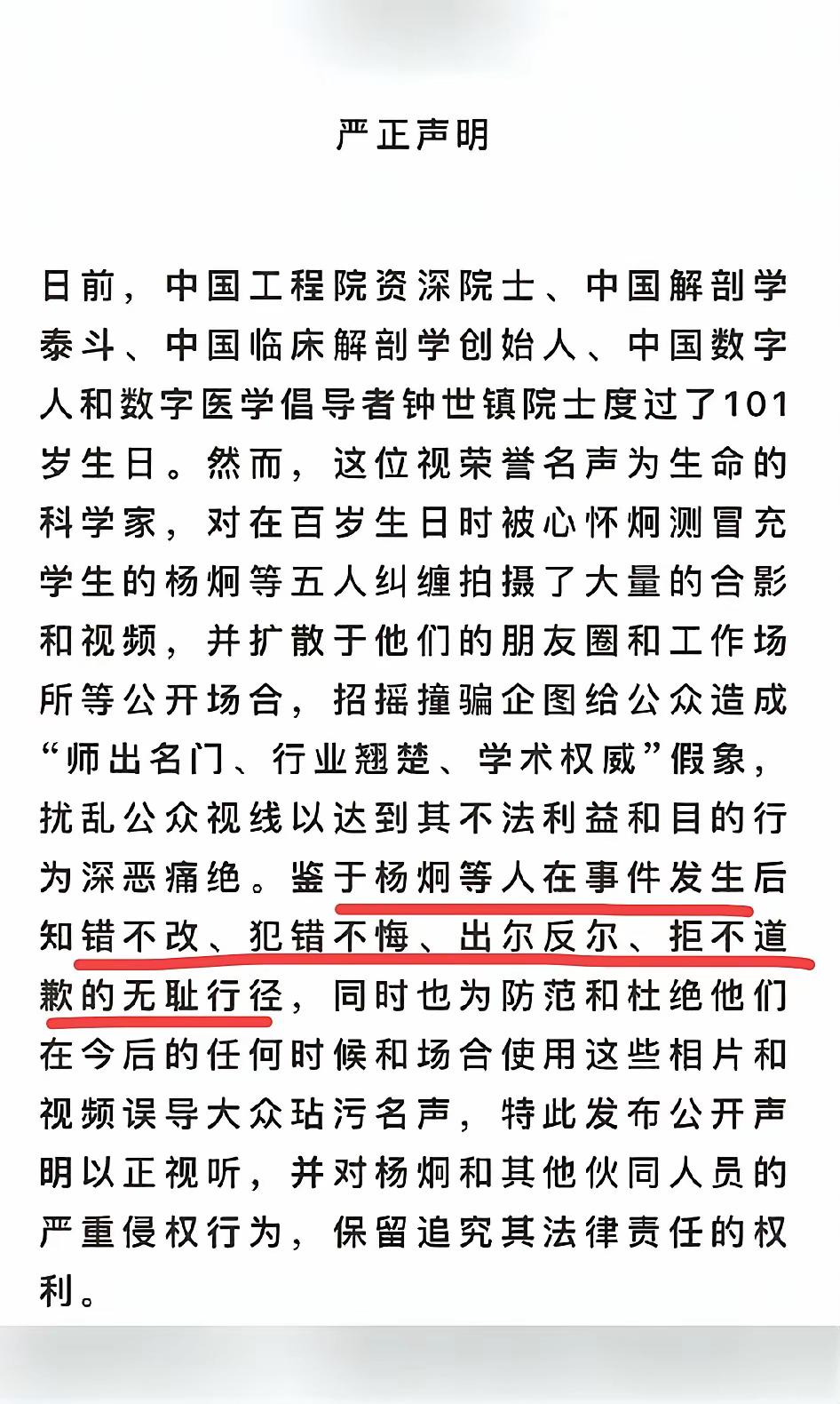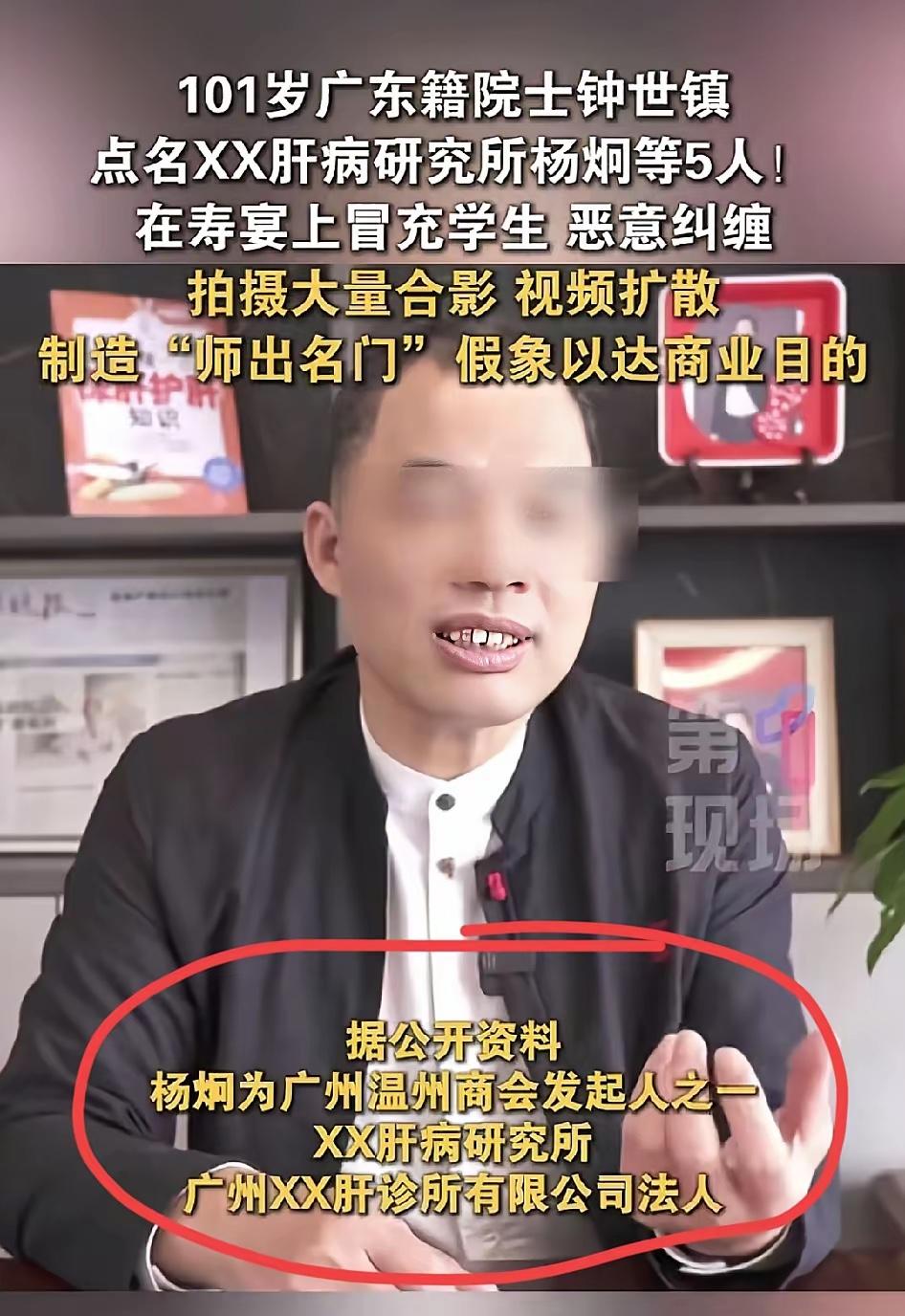 温州商人杨炯太离谱!闯钟老101岁寿宴蹭热度,硬套关系反把自己坑上热搜! 谁能想到,钟老101岁寿宴,竟被人当成了“蹭名工具”!这个叫杨炯的温州商人,操作实在让人不齿,好好的寿宴被搅得没了清净,网友看完都怒了。 了解后才知道,杨炯不简单——既是温州商会的发起人之一,还开着一家肝病研究公司。明眼人一看就懂,他要是能跟钟老扯上关系,不管是拍张合照还是搭句话,对他的生意来说都是“大助力”。 可正常渠道见不到、套不上关系,他竟想出了歪招:直接假冒钟老的学生,硬闯进寿宴现场,拿着手机一顿狂拍,就盼着能留下“同框证据”。要知道,没经过本人同意就拍照,还想着以后用合照谋利,这早就侵犯了别人的权益,就算被追诉,也是他自找的。 更气人的是,事情败露后,他不仅不认错,还拒不道歉,丝毫没觉得自己搅乱老人寿宴有错。直到对方正式发了声明,把这事摆到明面上,他之前的心思全白费不说,倒是真“出名”了——可惜这名声,是人人唾骂的“蹭热度败类”,半点儿正面作用都没有。 想想钟老都101岁了,这么难得、这么有纪念意义的生日,本该安安稳稳过,结果被他这么一闹,添了多少堵!不少人都建议,明年再办寿宴,一定要把好门、把好关,别再让这种别有用心的人钻了空子,辜负了老人家的清净。你们觉得,杨炯这事该怎么处理才解气?