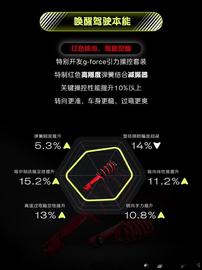 特别版有专属车色、拉花、轮圈等,最重要的是g-force引力操控套装,让它的操控性更好一些,大概有10%的操控性能提升。