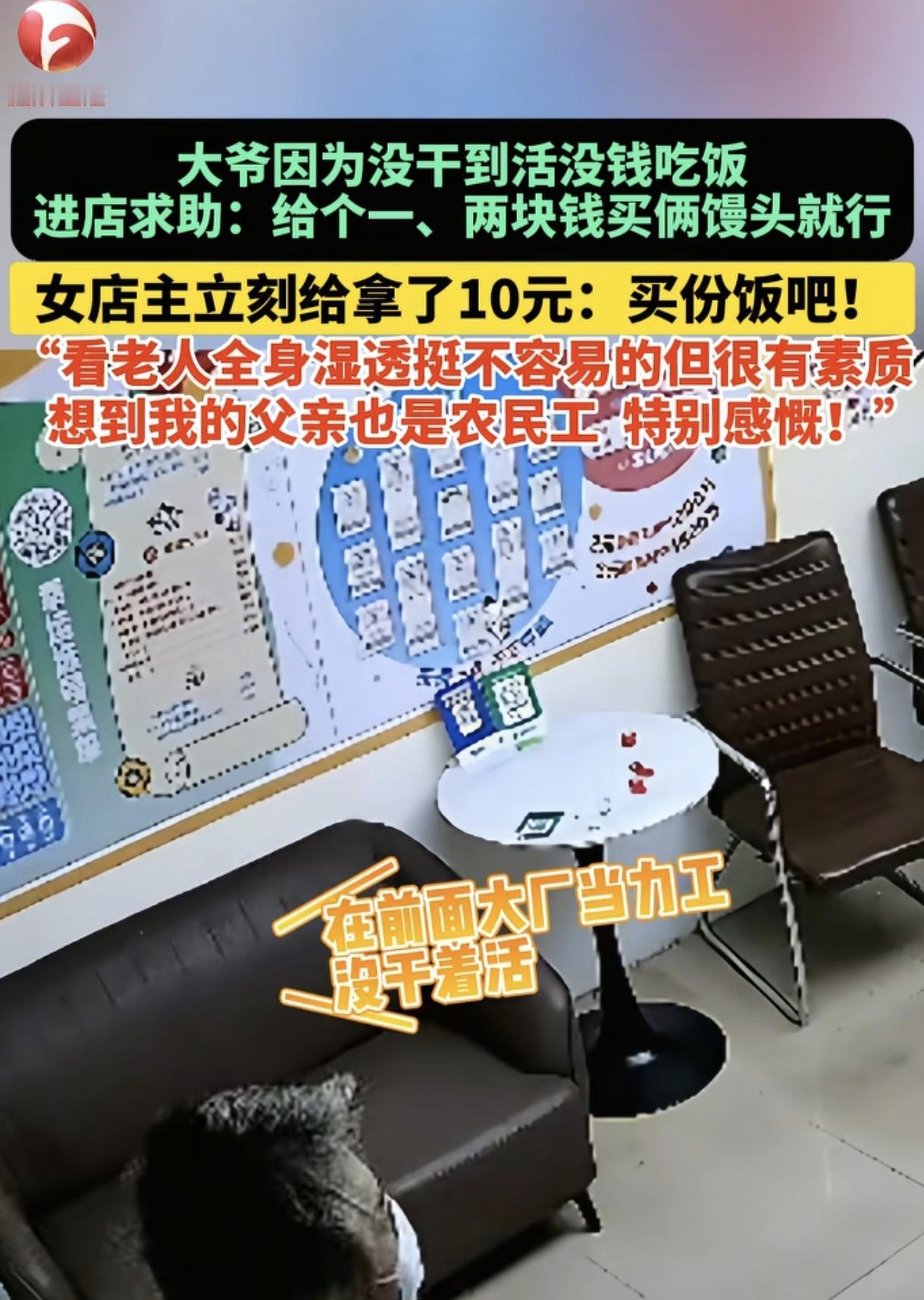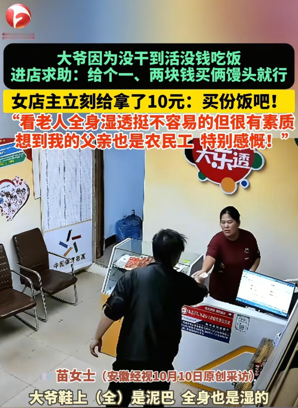 “暖心!”六旬大爷因为没干着活没钱吃饭,走进一家彩票店向老板求助:“可以给我一两块钱买两馒头填饱一下肚子吗?”没成想老板二话没说,直接拿出10元钱让大爷买一份饭吃,大爷连声感谢。老板:看他全身湿透挺不容易的,我父亲也是农民工,太感慨了。网友:10块钱富不了他,也穷不了我,能帮就帮,老板心地善良,好人一生平安。 (来源:@AHTV第一时间) 10月11日中午12点多,山东淄博,天空正下着大雨,彩票店老板苗女士正在店里忙活着,这时她突然抬头看见一位六七十岁的大爷站在了店门口。 大爷没有撑伞,浑身被淋得湿漉漉的,鞋子上全是泥巴,看起来十分狼狈又可怜,苗女士第一反应以为老人是想进店来换衣服的,没成想老人另有所求。 大爷很有礼貌地对苗女士说:“您好,我不是来买彩票的,我......”大爷貌似遇上了难以启齿的困难,一时又不知从何说起。苗女士忙安慰说:“没事,您说。” 随后大爷表明了自己的身份,说出了求助的原委:“我是东北吉林长春的,在前面大厂当力工,这几天下雨没干着活,从昨天晚上到现在都没吃饭,就想问一下,能不能帮个忙给一两块钱,我买两个馒头填饱一下肚子就行......” 也就是说,这位大爷是一位农民工,干的估计还是临时工的活,但由于连着几天下雨,就没活干了,也没钱吃饭了,甚至还饿了两顿,到第二天中午饿得实在受不了,才鼓足勇气走进彩票店求助。 令人费解的是,老人身上难道就没一点余钱以备不时之需吗?其实农民工拿到工资后第一时间就是给老家汇去只留一点点饭钱在身上,而一旦遇上活接不上,就容易出现没钱吃饭的情况。其实若生活好过,谁还会离乡背井外出打工呢?农民工着实不易啊。 出门在外,谁还没个困难呢?苗女士从老人身上仿佛看到了自己父亲的影子,她的父亲也是一位农民工,现在这位老人狼狈又落魄,实在太不容易了,恻隐之心油然而生。 她二话没说,从抽屉里拿出10块钱递向老人:“您拿这钱买份饭吃吧。”这完全超出了老人求助的预期,老板估计认为一两块钱并不能解决老人当前的饥肠辘辘。 老人十分错愕,眼里闪出一道欣喜与感激的光,他没想到女子竟如此的慷慨大方,真是遇着好心人了。 从谈吐看,老人彬彬有礼,很有素质,此刻他又展现出素质的一面,将覆满泥的鞋子在纸壳上蹭了又蹭,生怕弄脏老板的地板,这才走进店接过老板手上的钱,连声称谢。 而对于这一救助老人的小插曲,苗女士深有感触,她的父亲也是农民工,说不定也有需要帮助的时候,爱出者爱返,帮助了大爷,就是帮助了父亲,帮助了自己。 之后苗女士将视频发布在网上感慨一下,很快视频就火了,并被@AHTV第一时间等新闻媒体转发,引发网友热议。 有网友说,大姐很善良,看到大爷全身湿透,脚上全是泥,果断给钱相帮,换作是我也会帮,不然心里难安。 也有网友说,听老人口音确实是我们东北的,自报家门是真遇到困难了,感谢大姐帮助我们东北人,希望所有在外的东北人都能得到善待。 还有网友质疑大爷有可能是假的,不过也有网友说了,10块钱富不了他,也穷不了我,能帮就帮,万一是真的呢,就算假的也没多少钱我也认了。 更有网友分享:摩旅全国时在吉林深有感触,当时摔伤了,想借民宿老板洗衣服,结果老板二话没说就把我衣服拿去洗了,而且还是手洗,让我受宠若惊,吉林人是真好。 这个小故事令人感慨万千,它本质是底层陌生人之间的善意传递,大姐没有纠结该不该帮,而是直接用十元钱解决大爷的吃饭问题,让这一份实在有了温度。 这一份不刻意的善意,最能打动人心,让我们看到了平凡人身上的共情力—比起判断对方“值不值得帮”,先解决老人眼前的“饿不饿”更重要。