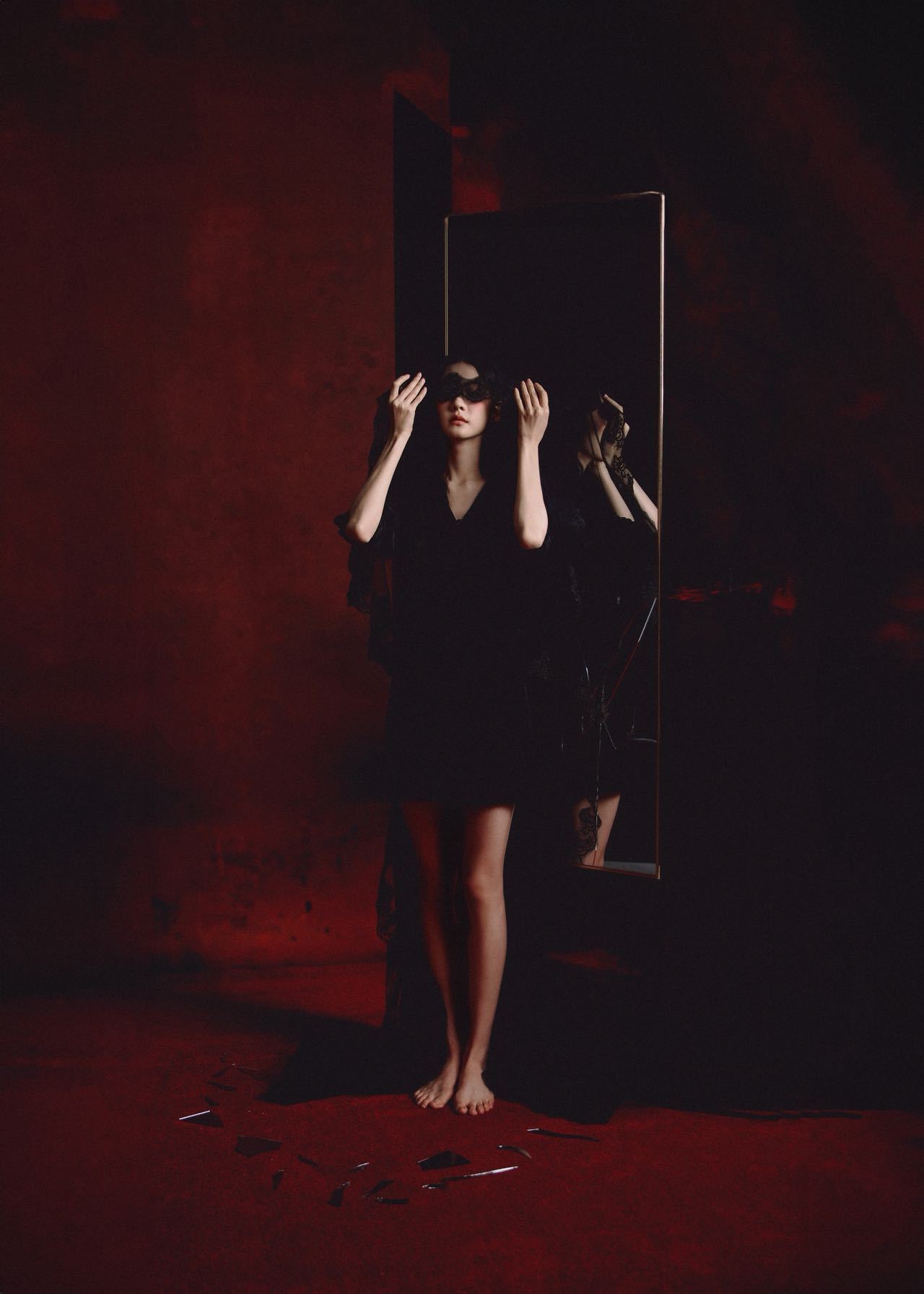 丝绒黑裙裹着纤细腰线,半透明的黑纱披在头上,眼尾一抹暗调眼影像淬了星光,连垂眸时的睫毛阴影都透着精致的疏离感。。。像暗黑童话里神秘的怪力少女又活脱脱一朵从古堡里绽出的冷艳玫瑰。