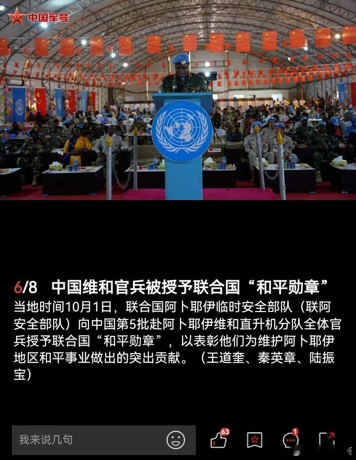 当地时间10月1日,联合国阿卜耶伊临时安全部队(联阿安全部队)向中国第5批赴阿卜耶伊维和直升机分队全体官兵授予联合国“和平勋章”,以表彰他们为维护阿卜耶伊地区和平事业做出的突出贡献。(中国军号)
