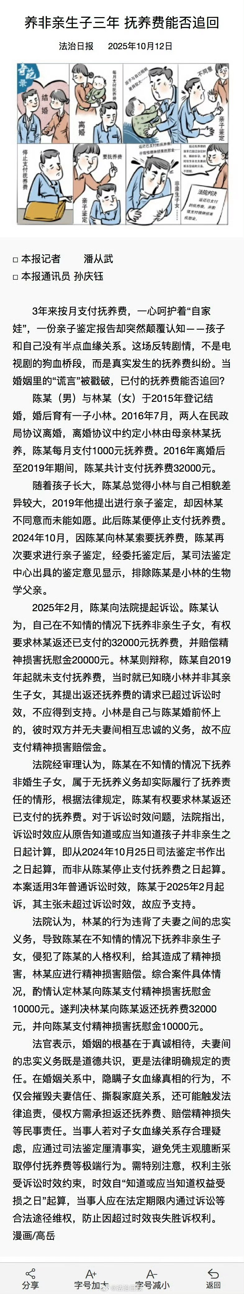 法院经审理认为,陈某在不知情的情况下抚养非婚生子女,属于无抚养义务却实际履行了抚养责任的情形,根据法律规定,陈某有权要求林某返还已支付的抚养费。对于诉讼时效问题,法院指出,诉讼时效应从原告知道或应当知道孩子并非亲生之日起计算,即从2024年10月25日司法鉴定书作出之日起算,而非从陈某停止支付抚养费之日起算。本案适用3年普通诉讼时效,陈某于2025年2月起诉,其主张未超过诉讼时效,故应予支持。#抚养3年非亲生子抚养费能追回吗#(法治日报)