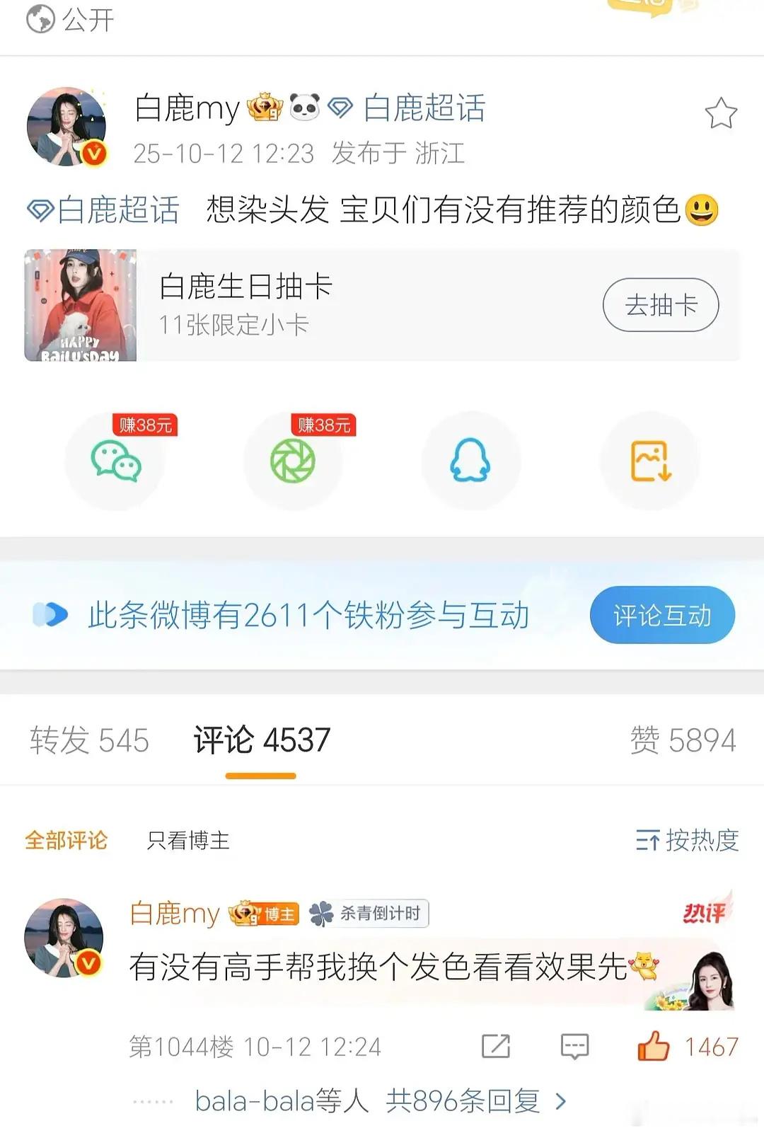 白鹿在超话说自己要染发了,适合哪个颜色?