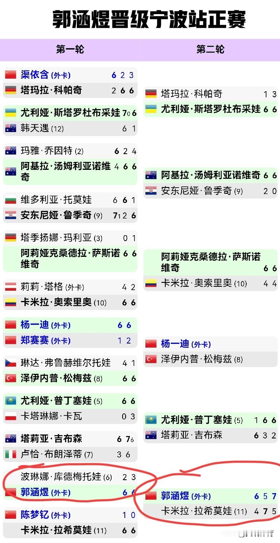 郭涵煜连续战胜俄罗斯“套娃” 先胜波琳娜·库德梅托娃 (6号种子) 再胜卡米拉·拉希莫娃 (11号种子) 晋级WTA500宁波站正赛。 郭涵煜即时世界排名来到第190名。