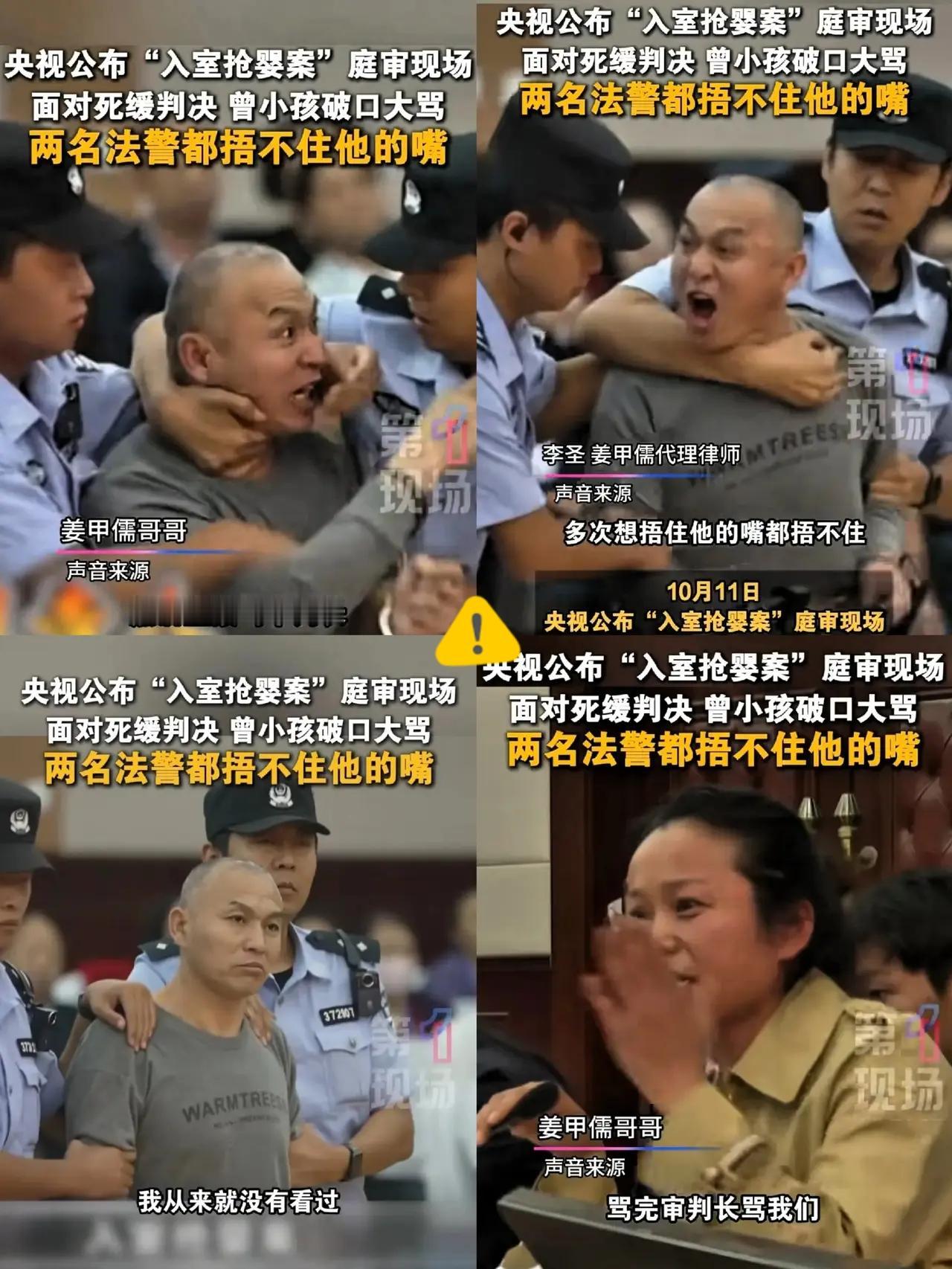 央视曝光的山东入室抢婴案庭审画面,真是看得人拳头都硬了! 主犯曾某孩被判死缓后那副嘴脸,简直刷新恶的底线——当众破口大骂,法警两次捂嘴都挡不住脏话,还抖着腿一脸嚣张,半分悔意都没有。 死缓本是法律留的余地,但这余地该给有悔意的人,不是给恶到骨子里的恶魔。19年前他带人造次,用钢筋抵住老人胸口,把8个月大的姜甲儒抢走去卖,28600元就毁了一个家:爷爷抱憾病逝,母亲寻子差点坠崖,孩子被"囚禁"着长大17年,连出门看世界的权利都没有。 法律讲罪责刑相适应,可他这毫无收敛的嚣张,分明是没被震慑到。姜家要抗诉太能理解了,这种连伪装愧疚都懒得做的罪犯,真配得上法律的"手下留情"吗?你们觉得这样的恶该怎么罚才解气?