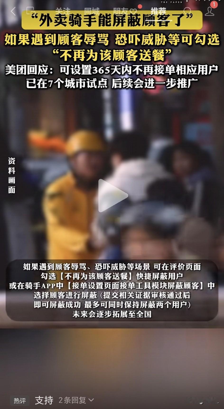 告别“奇葩”顾客!美团上线骑手屏蔽功能,设置后一年内不再接该顾客的单! 近日,有网友发帖据称美团上线了新功能,骑手拥有了屏蔽拉黑顾客的自主权! 此次上线的新功能包括骑手评价用户和骑手屏蔽客户功能,订单结束后的48小时内,骑手可以在平台评价用户,对于那些辱骂、威胁骑手的“奇葩”用户,骑手可以自主选择屏蔽掉。 屏蔽后,365天之内骑手不会再接到该用户的单。 该功能已经在晋江、绍兴等7个城市试点,未来会逐步扩大范围。 消息一出,很多网友纷纷叫好! “就应该这样,让那些奇葩顾客没饭吃!” “不仅仅态度恶劣的,还有吃霸王餐的也一律屏蔽,没人接他们单。” “支持!每个人都有自己的情绪需求!” “我作为顾客,举双手支持!” “双向选择,很好!” 更有网友说,别试点了,赶紧全国推广吧! 甚至有商家出来说,“啥时候给商家也设置个屏蔽用户的功能?有些人的生意真不想做!” 更有甚者,要求将这个屏蔽功能拓展到各行各业的服务行业。 随着各种生活便利方式的推出,人的诚信问题也开始突出,各种矛盾层出不穷。 美团的这次功能优化升级,确实在维护骑手利益上做了很多的保护,也能够给其他骑手提供参考。 只是事情总有两面性,有些矛盾可能不是一方的责任,也需要监控骑手不要随意差评,不让平台成为某些人泄私愤的温床。 这个功能究竟是利大于弊,还是弊大于利,还要看7市的试点结果。 大家对这个新功能怎么看?一起来评论区聊一聊! 信息来源于澎湃新闻,侵联删! “