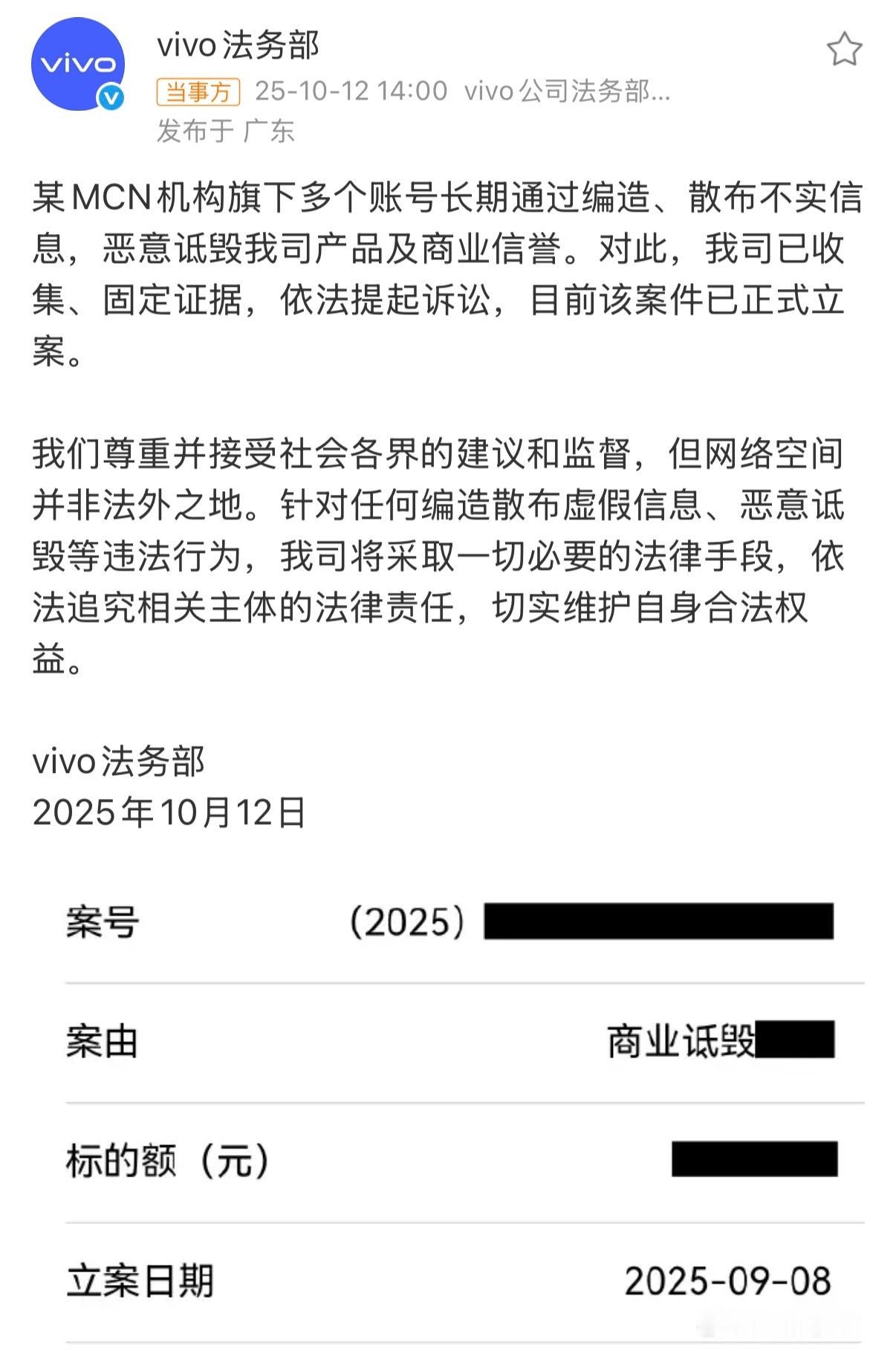 vivo法务部发文很少看到vivo法务出动,看来这次真是忍无可忍了……蓝厂一直本本分分,埋头种因,认真打磨产品,很少参与行业争斗,不知道是哪家MCN没事找事,编造谣言!
